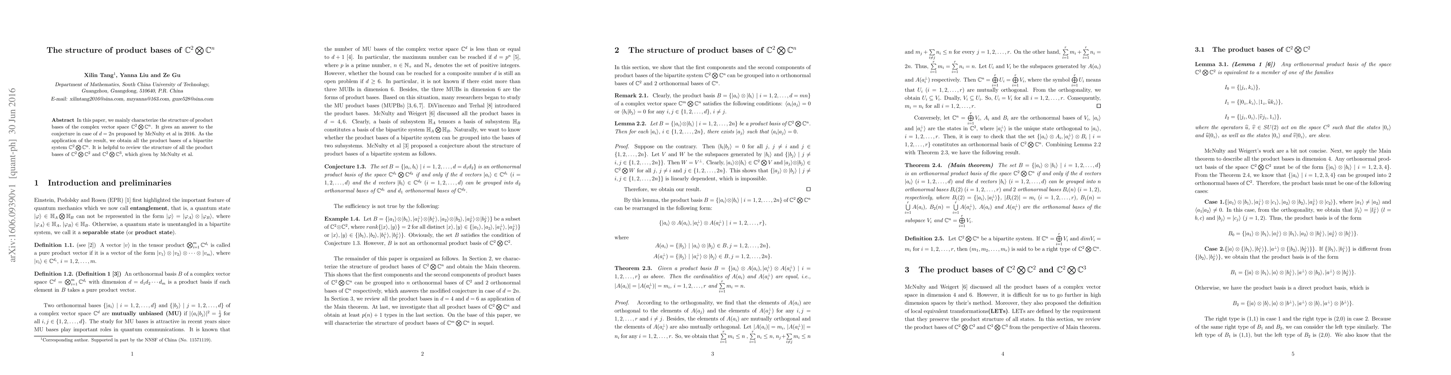 This paper characterizes the structure of product bases for the complex vector space $\mathbb{C}^{2}\bigotimes\mathbb{C}^{n}$, resolving the conjecture by McNulty et al. for $d=2n$. It provides a comprehensive overview of all product bases for bipartite systems $\mathbb{C}^{2}\bigotimes\mathbb{C}^{n}$.