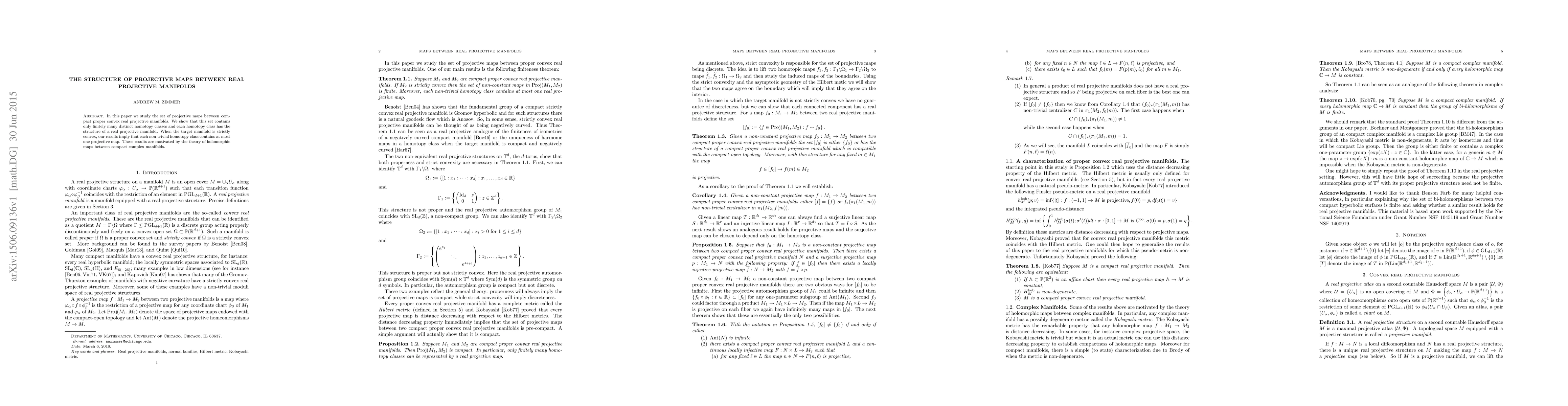 This paper investigates projective maps between compact convex real projective manifolds, demonstrating that there are only finitely many distinct homotopy classes, each structured as a real projective manifold. For strictly convex target manifolds, it shows that non-trivial classes contain at most one projective map, inspired by the theory of holomorphic maps in complex manifolds.