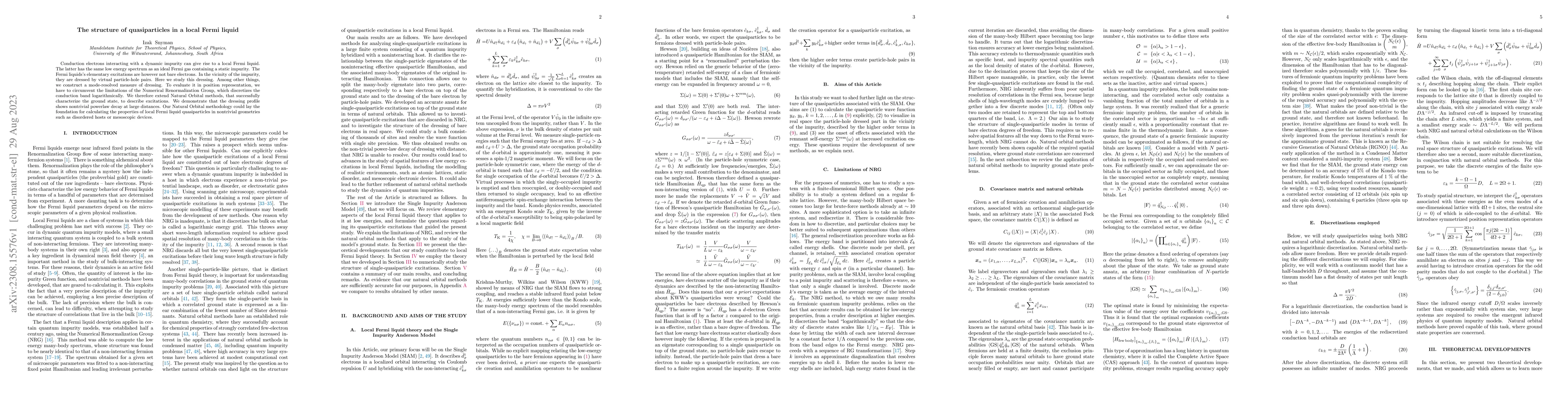 This paper investigates the quasiparticles in a local Fermi liquid formed by conduction electrons interacting with a dynamic impurity. It introduces a mode-resolved measure of the dressing of these quasiparticles by virtual particle-hole pairs, extending Natural Orbital methods to overcome limitations of the Numerical Renormalization Group. The study reveals a nontrivial powerlaw decay of the dressing profile at large distances, potentially enabling calculations of quasiparticle properties in complex geometries.
