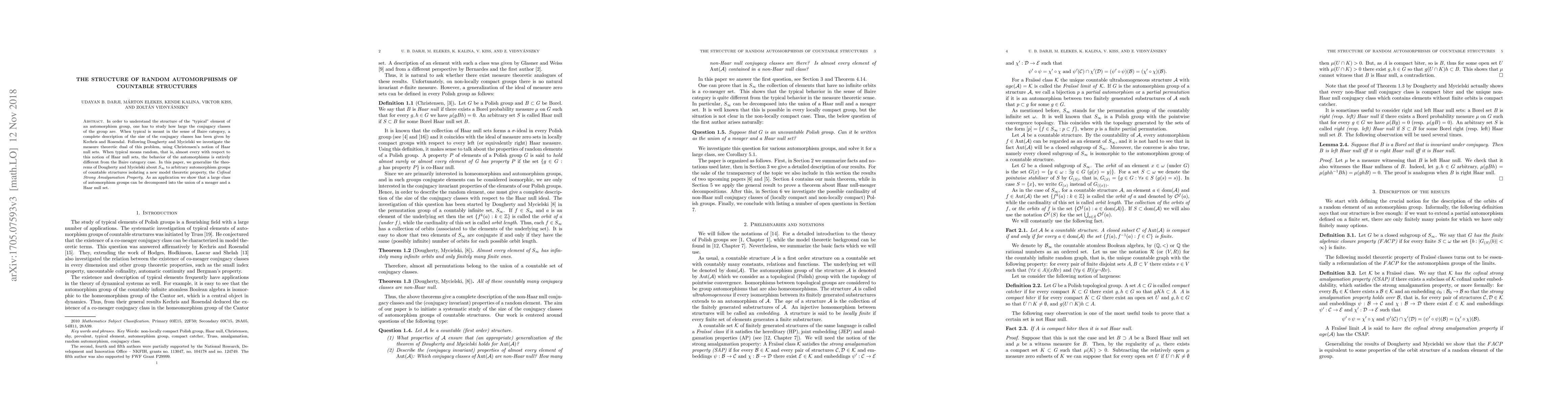 This paper studies the typical structure of random automorphisms in countable structures, contrasting Baire category and Haar null sets. It generalizes previous results on $S_\infty$ and introduces a new model-theoretic property, demonstrating that many automorphism groups decompose into meager and Haar null sets.