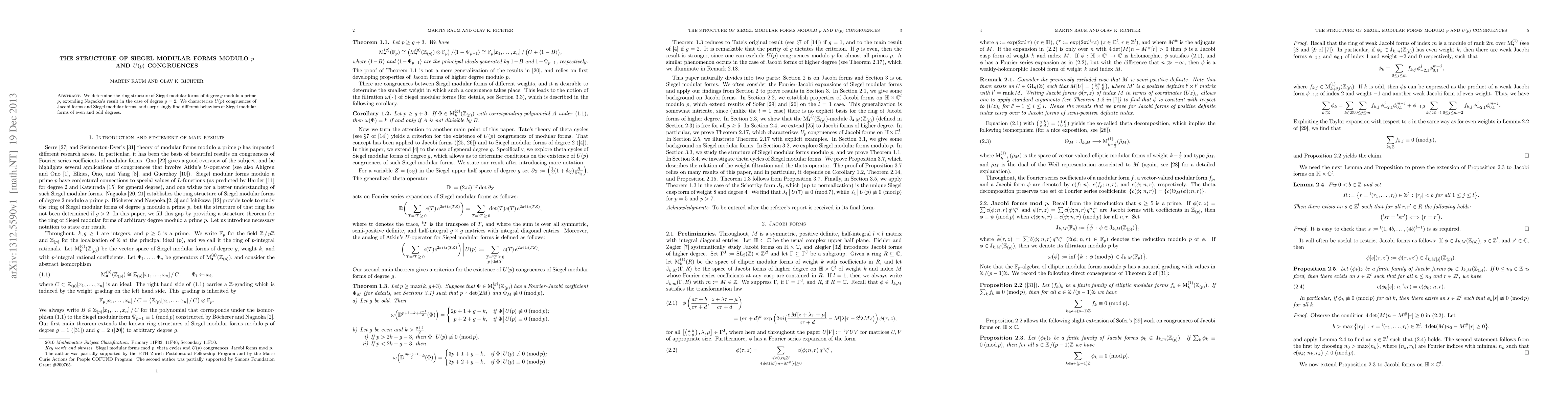 The paper investigates the ring structure of Siegel modular forms of degree g modulo a prime p, extending previous work for g=2, and characterizes U(p) congruences revealing distinct behaviors for Siegel modular forms of even and odd degrees.