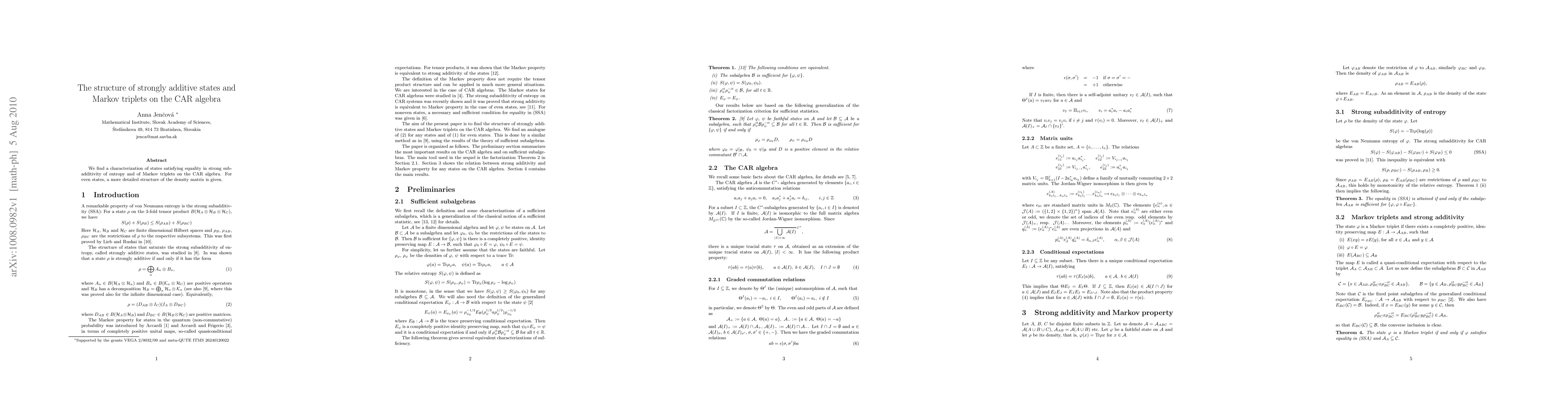 Summary: This paper characterizes states on the CAR algebra that meet the equality condition in strong subadditivity of entropy and defines Markov triplets. It provides a detailed structure for the density matrix of even states.