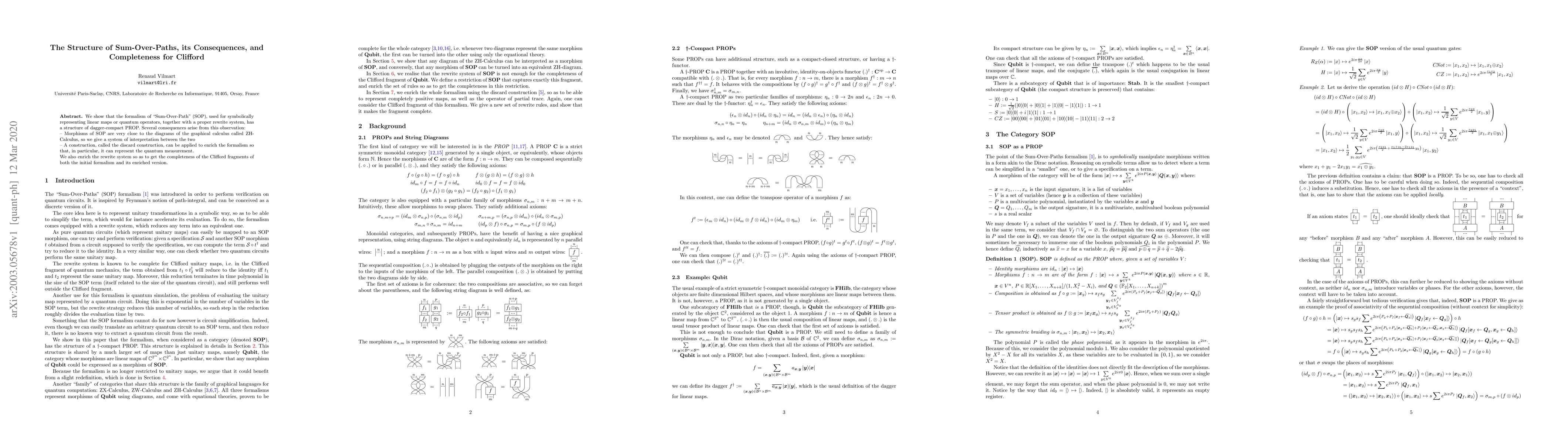 The paper demonstrates that the "Sum-Over-Paths" (SOP) formalism, used to represent linear maps and quantum operators, forms a dagger-compact PROP, leading to its close relation with the ZH-Calculus. It also introduces a discard construction to enrich SOP, enabling it to represent quantum measurement, and proves completeness for Clifford fragments in both the original and enriched versions.