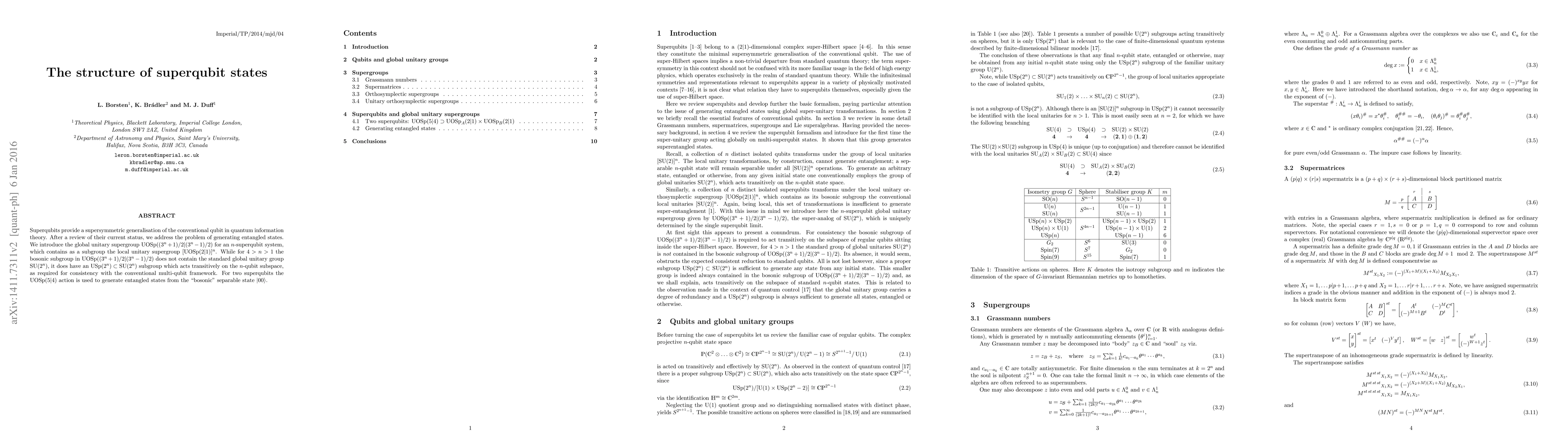Superqubits provide a supersymmetric generalisation of the conventional qubit in quantum information theory. After a review of their current status, we address the problem of generating entangled states. We introduce the global unitary supergroup $\text{UOSp}((3^n+1)/2 | (3^n-1)/2)$ for an $n$-superqubit system, which contains as a subgroup the local unitary supergroup $[\text{UOSp}(2|1)]^n$. While for $4>n>1$ the bosonic subgroup in $\text{UOSp}((3^n+1)/2 | (3^n-1)/2)$ does not contain the standard global unitary group $\text{SU}(2^n)$, it does have an $\text{USp}(2^n)\subset\text{SU}(2^n)$ subgroup which acts transitively on the $n$-qubit subspace, as required for consistency with the conventional multi-qubit framework. For two superqubits the $\text{UOSp}(5|4)$ action is used to generate entangled states from the "bosonic" separable state $|00\rangle$.
