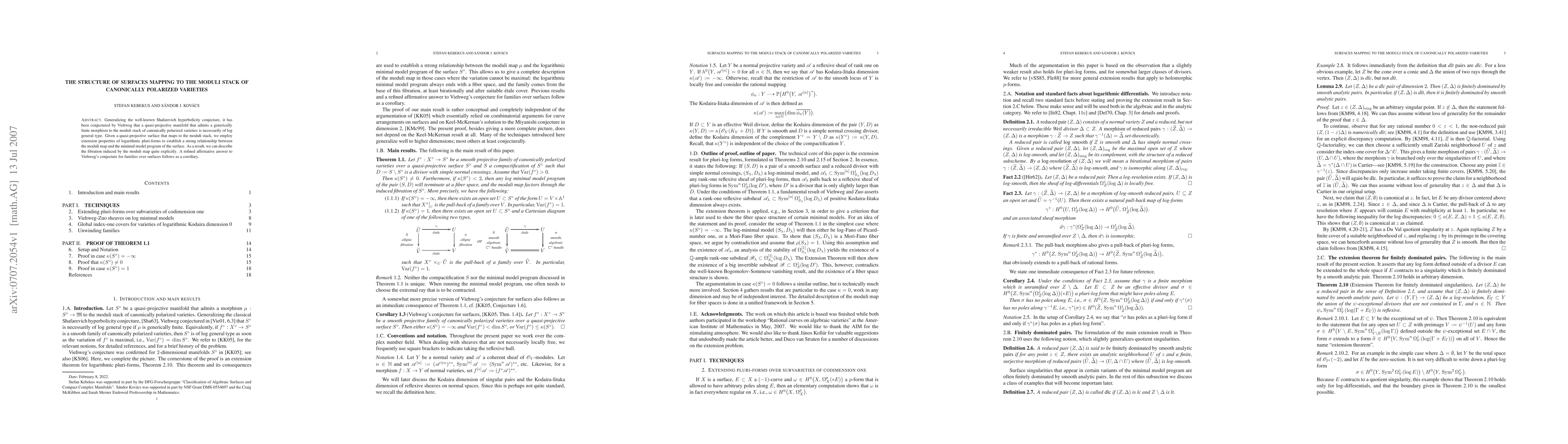 Generalizing the well-known Shafarevich hyperbolicity conjecture, it has been conjectured by Viehweg that a quasi-projective manifold that admits a generically finite morphism to the moduli stack of canonically polarized varieties is necessarily of log general type. Given a quasi-projective surface that maps to the moduli stack, we employ extension properties of logarithmic pluri-forms to establish a strong relationship between the moduli map and the minimal model program of the surface. As a result, we can describe the fibration induced by the moduli map quite explicitly. A refined affirmative answer to Viehweg's conjecture for families over surfaces follows as a corollary.