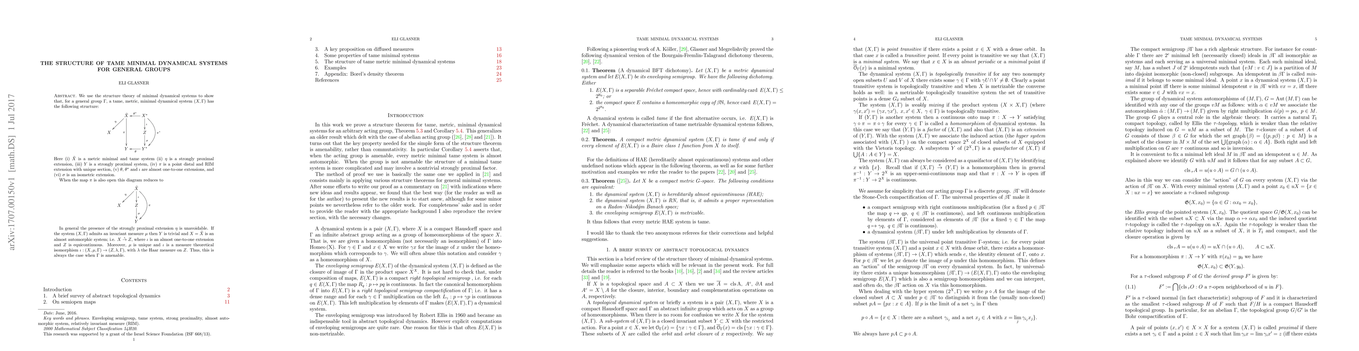 This paper explores the structure of tame, metric, minimal dynamical systems for general groups $\Gamma$. It demonstrates that such systems exhibit a specific diagram structure involving extensions and mappings, with $\tilde{X}$ being a metric minimal and tame system. When $\pi$ is open, the diagram simplifies, and if an invariant measure exists, the system becomes almost automorphic.
