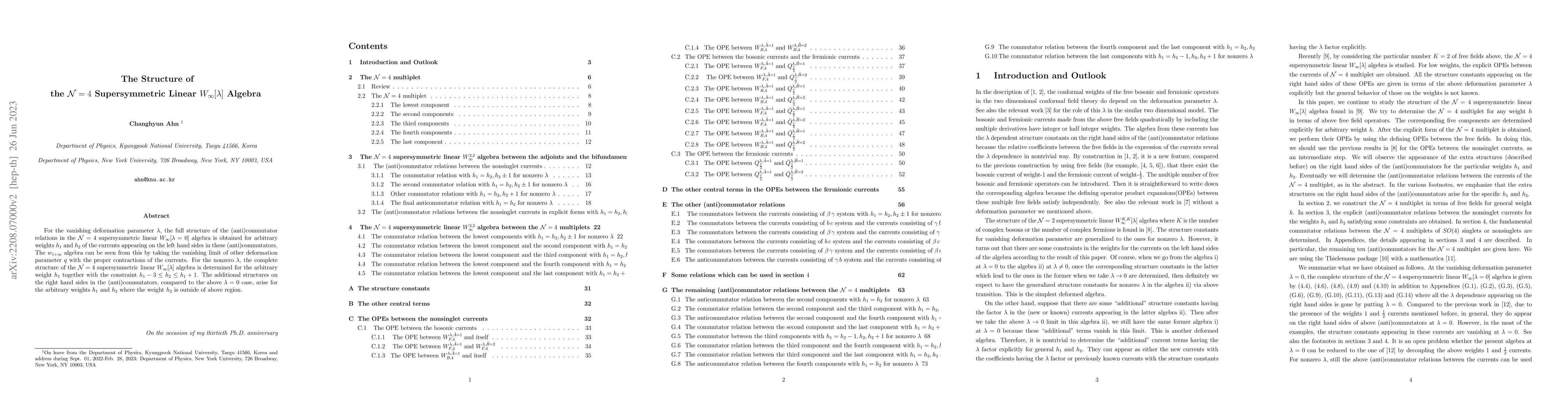For the vanishing deformation parameter $\lambda$, the full structure of the (anti)commutator relations in the ${\cal N}=4$ supersymmetric linear $W_{\infty}[\lambda=0]$ algebra is obtained for arbitrary weights $h_1$ and $h_2$ of the currents appearing on the left hand sides in these (anti)commutators. The $w_{1+\infty}$ algebra can be seen from this by taking the vanishing limit of other deformation parameter $q$ with the proper contractions of the currents. For the nonzero $\lambda$, the complete structure of the ${\cal N}=4$ supersymmetric linear $W_{\infty}[\lambda]$ algebra is determined for the arbitrary weight $h_1$ together with the constraint $h_1-3 \leq h_2 \leq h_1+1$. The additional structures on the right hand sides in the (anti)commutators, compared to the above $\lambda=0$ case, arise for the arbitrary weights $h_1$ and $h_2$ where the weight $h_2$ is outside of above region.