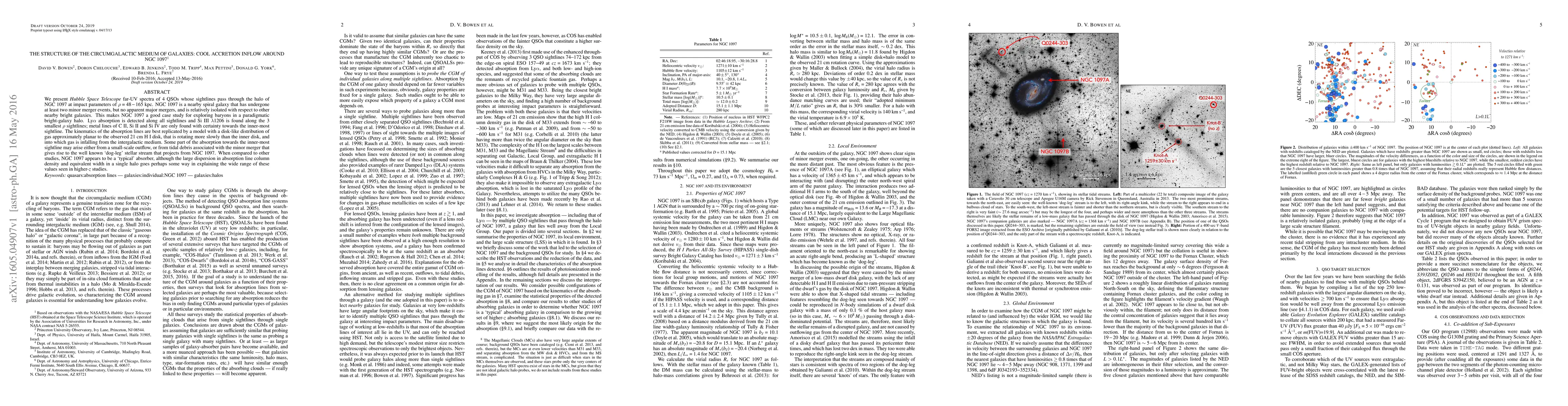 We present Hubble Space Telescope far-UV spectra of 4 QSOs whose sightlines pass through the halo of NGC 1097 at impact parameters of 48 -165 kpc. NGC 1097 is a nearby spiral galaxy that has undergone at least two minor merger events, but no apparent major mergers, and is relatively isolated with respect to other nearby bright galaxies. This makes NGC 1097 a good case study for exploring baryons in a paradigmatic bright-galaxy halo. Lyman-alpha absorption is detected along all sightlines and Si III 1206 is found along the 3 smallest impact parameter sightlines; metal lines of C II, Si II and Si IV are only found with certainty towards the inner-most sightline. The kinematics of the absorption lines are best replicated by a model with a disk-like distribution of gas approximately planar to the observed 21 cm H I disk, that is rotating more slowly than the inner disk, and into which gas is infalling from the intergalactic medium. Some part of the absorption towards the inner-most sightline may arise either from a small-scale outflow, or from tidal debris associated with the minor merger that gives rise to the well known `dog-leg' stellar stream that projects from NGC 1097. When compared to other studies, NGC 1097 appears to be a `typical' absorber, although the large dispersion in absorption line column density and equivalent width in a single halo goes perhaps some way in explaining the wide range of these values seen in higher-redshift studies.