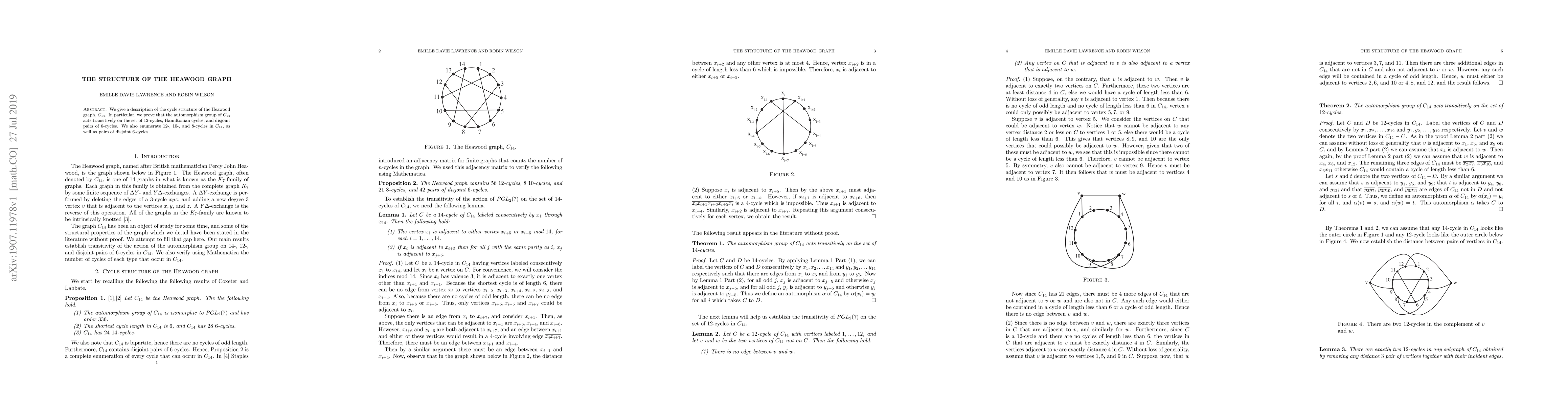 We give a description of the cycle structure of the Heawood graph, $C_{14}$. In particular, we prove that the automorphism group of $C_{14}$ acts transitively on the set of $12$-cycles, Hamiltonian cycles, and disjoint pairs of $6$-cycles. We also enumerate $12$-, $10$-, and $8$-cycles in $C_{14}$, as well as pairs of disjoint $6$-cycles.