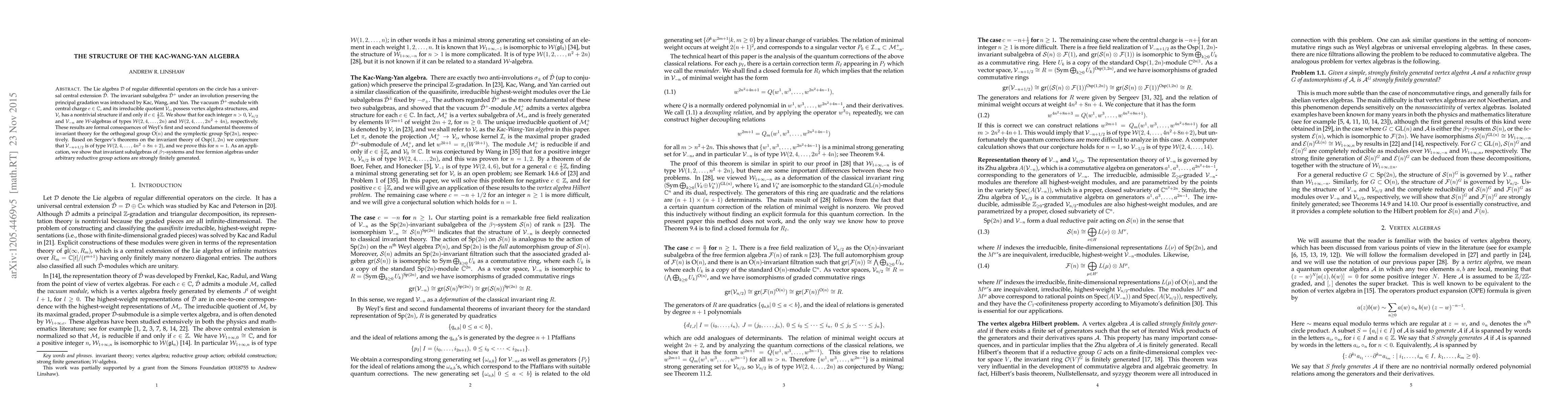 The paper investigates the structure of the Kac-Wang-Yan algebra, showing that certain modules have vertex algebra structures and relate to invariant theory of orthogonal and symplectic groups.