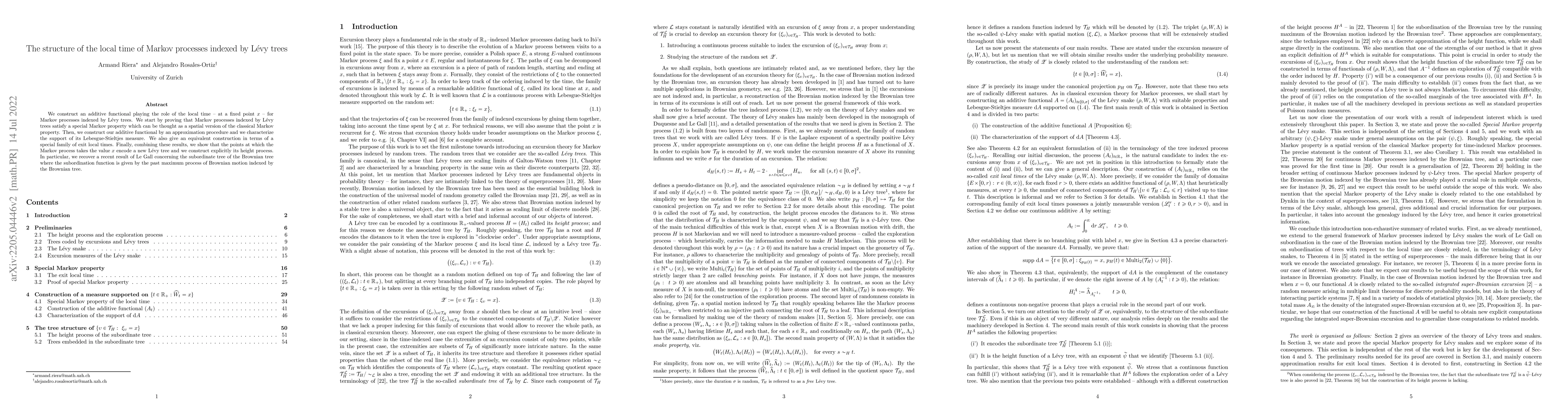This paper constructs the local time for Markov processes indexed by Lévy trees, demonstrating a unique Markov property and characterizing its Lebesgue-Stieltjes measure. It also establishes an equivalent construction using exit local times and shows that the value occurrences form a new Lévy tree, explicitly constructing its height process.