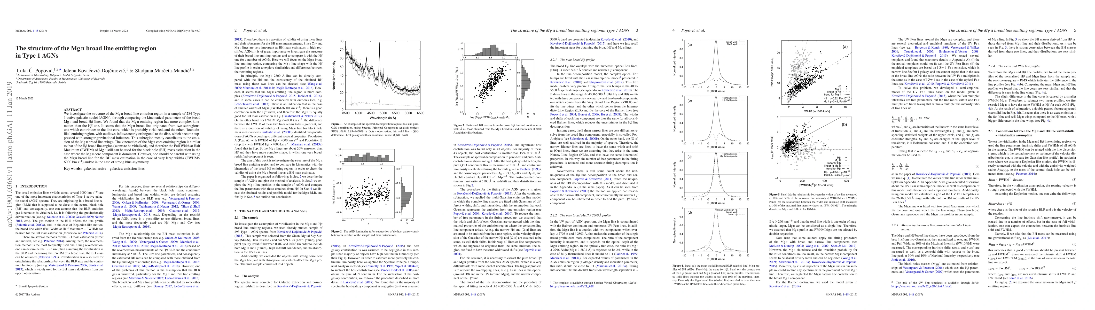 We investigate the structure of the Mg II broad line emission region in a sample of 284 Type 1 active galactic nuclei (AGNs), through comparing the kinematical parameters of the broad Mg II and broad H$\beta$ lines. We found that the Mg II emitting region has more complex kinematics than the H$\beta$ one. It seems that the \ion{Mg}{ii} broad line originates from two subregions: one which contributes to the line core, which is probably virialized, and the other, 'fountain-like' emitting region, with outflows-inflows nearly orthogonal to the disc, which become suppressed with stronger gravitational influence. This subregion mostly contributes to the emission of the Mg II broad line wings. The kinematics of the Mg II core emitting region is similar to that of the H$\beta$ broad line region (seems to be virialized), and therefore the Full Width at Half Maximum (FWHM) of Mg II still can be used for the black hole (BH) mass estimation in the case where the Mg II core component is dominant. However, one should be careful with using the \ion{Mg}{ii} broad line for the BH mass estimation in the case of very large widths (FWHM$>$ 6000 km s$^{-1}$) and/or in the case of strong blue asymmetry.