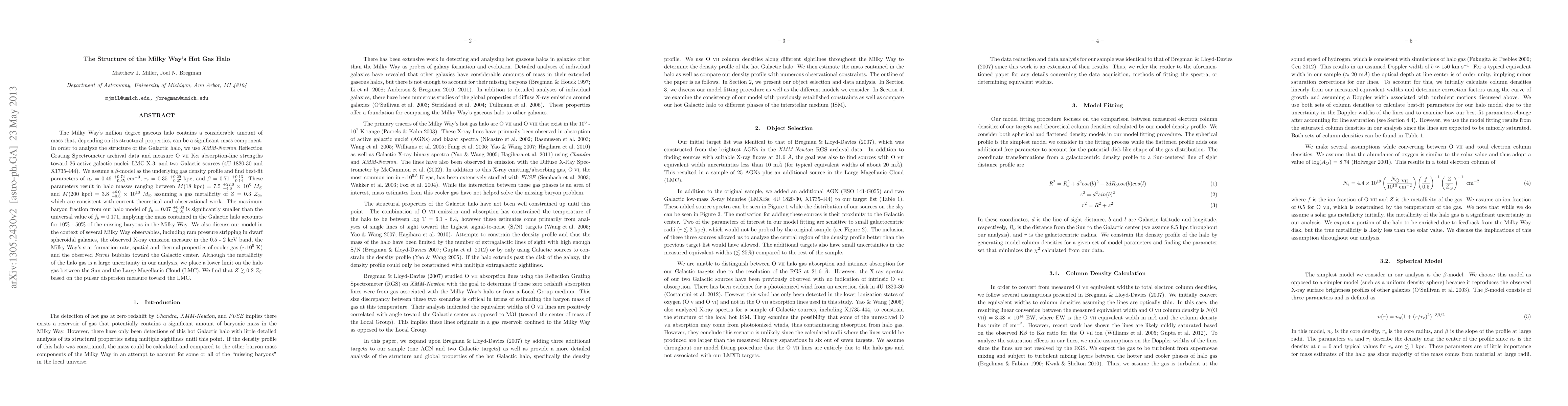This paper analyzes the structure of the Milky Way's hot gas halo using XMM-Newton data, finding a beta-model best-fit with parameters indicating a mass range of 7.5 x 10^8 to 3.8 x 10^10 M_sun. The study suggests the halo's baryon fraction is only 10%-50% of the missing baryons in the Milky Way, and discusses implications for various Milky Way observables.