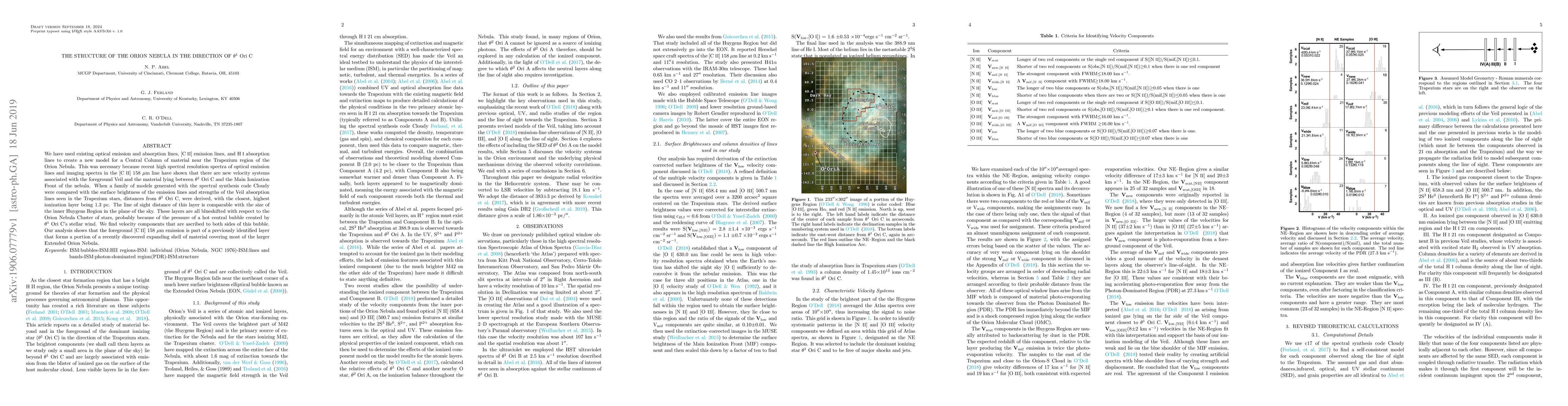 This paper models the Central Column in the Orion Nebula near Theta 1 Ori C using various emission and absorption lines, revealing new velocity systems and blueshifted layers likely influenced by the stellar wind from Theta 1 Ori C. The closest high-ionization layer is found to be 1.3 pc away, part of an expanding shell.