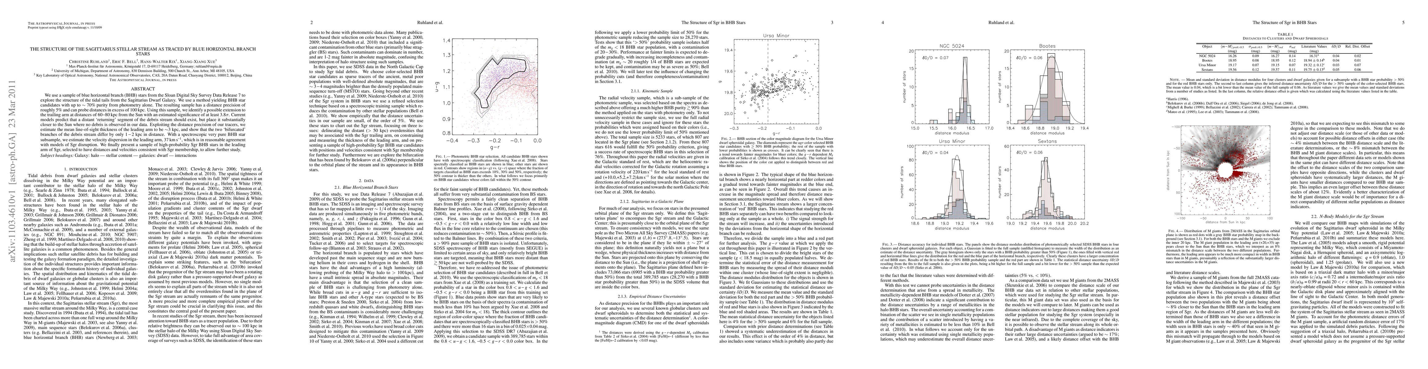 This paper investigates the structure of the Sagittarius Dwarf Galaxy's tidal tails using blue horizontal branch stars from the Sloan Digital Sky Survey, identifying a potential extension to the trailing arm at 60-80 kpc. The study estimates the leading arm's line-of-sight thickness at ~3 kpc and finds the bifurcation branches differ by 1-2 kpc in distance, with a velocity dispersion of 37 km s^-1 in the leading arm.