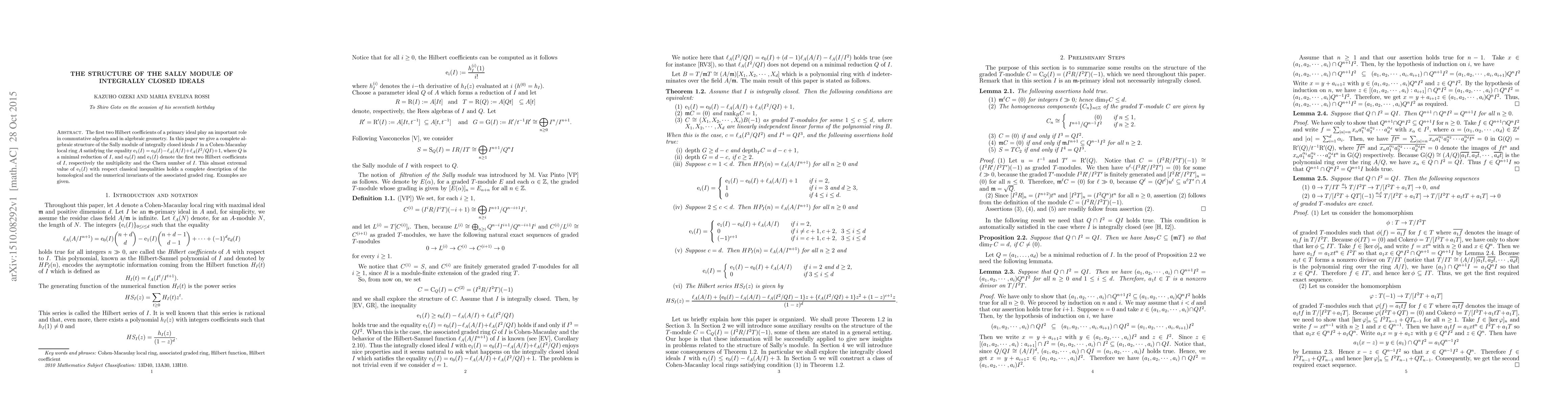 The first two Hilbert coefficients of a primary ideal play an important role in commutative algebra and in algebraic geometry. In this paper we give a complete algebraic structure of the Sally module of integrally closed ideals $I$ in a Cohen-Macaulay local ring $A$ satisfying the equality $\mathrm{e}_1(I)=\mathrm{e}_0(I)-\ell_A(A/I)+\ell_A(I^2/QI)+1, $ where $Q$ is a minimal reduction of $I$, and $\mathrm{e}_0(I)$ and $\mathrm{e}_1(I)$ denote the first two Hilbert coefficients of $I, $ respectively the multiplicity and the Chern number of $I$. This almost extremal value of $\mathrm{e}_1(I) $ with respect classical inequalities holds a complete description of the homological and the numerical invariants of the associated graded ring. Examples are given.