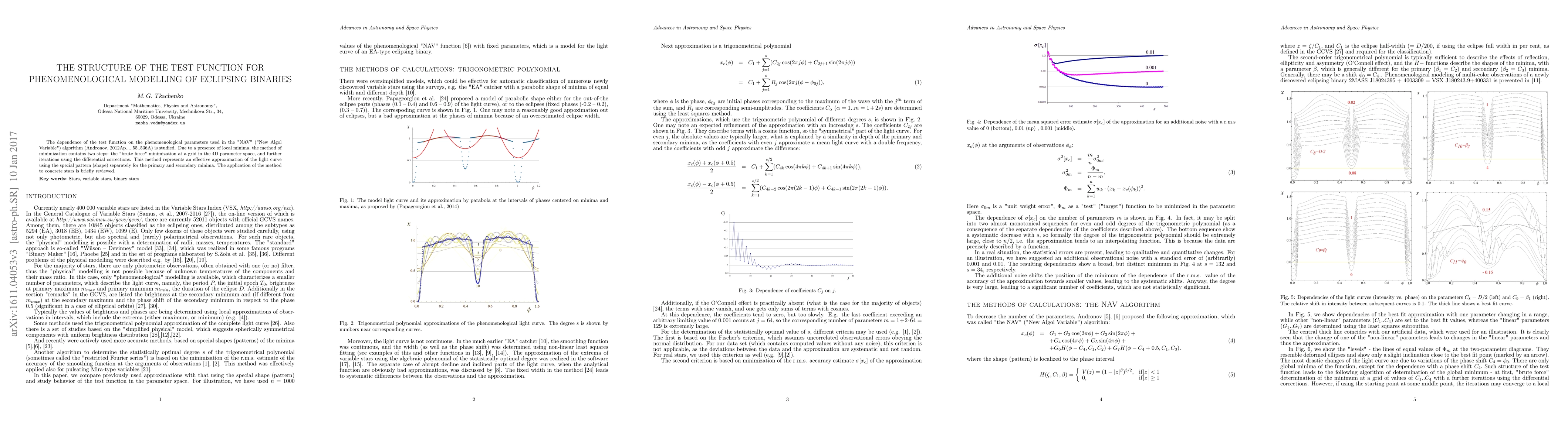 This paper investigates the test function's dependence on phenomenological parameters in the "NAV" algorithm for eclipsing binaries, employing a two-step minimization method to effectively approximate light curves. The method includes "brute force" minimization followed by differential corrections, and its application to specific stars is briefly reviewed.