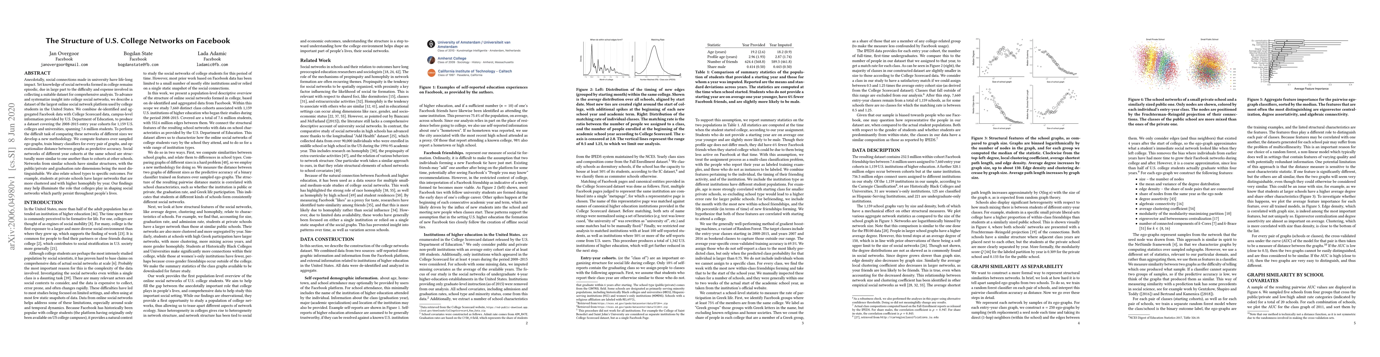 Anecdotally, social connections made in university have life-long impact. Yet knowledge of social networks formed in college remains episodic, due in large part to the difficulty and expense involved in collecting a suitable dataset for comprehensive analysis. To advance and systematize insight into college social networks, we describe a dataset of the largest online social network platform used by college students in the United States. We combine de-identified and aggregated Facebook data with College Scorecard data, campus-level information provided by U.S. Department of Education, to produce a dataset covering the 2008-2015 entry year cohorts for 1,159 U.S. colleges and universities, spanning 7.6 million students. To perform the difficult task of comparing these networks of different sizes we develop a new methodology. We compute features over sampled ego-graphs, train binary classifiers for every pair of graphs, and operationalize distance between graphs as predictive accuracy. Social networks of different year cohorts at the same school are structurally more similar to one another than to cohorts at other schools. Networks from similar schools have similar structures, with the public/private and graduation rate dimensions being the most distinguishable. We also relate school types to specific outcomes. For example, students at private schools have larger networks that are more clustered and with higher homophily by year. Our findings may help illuminate the role that colleges play in shaping social networks which partly persist throughout people's lives.