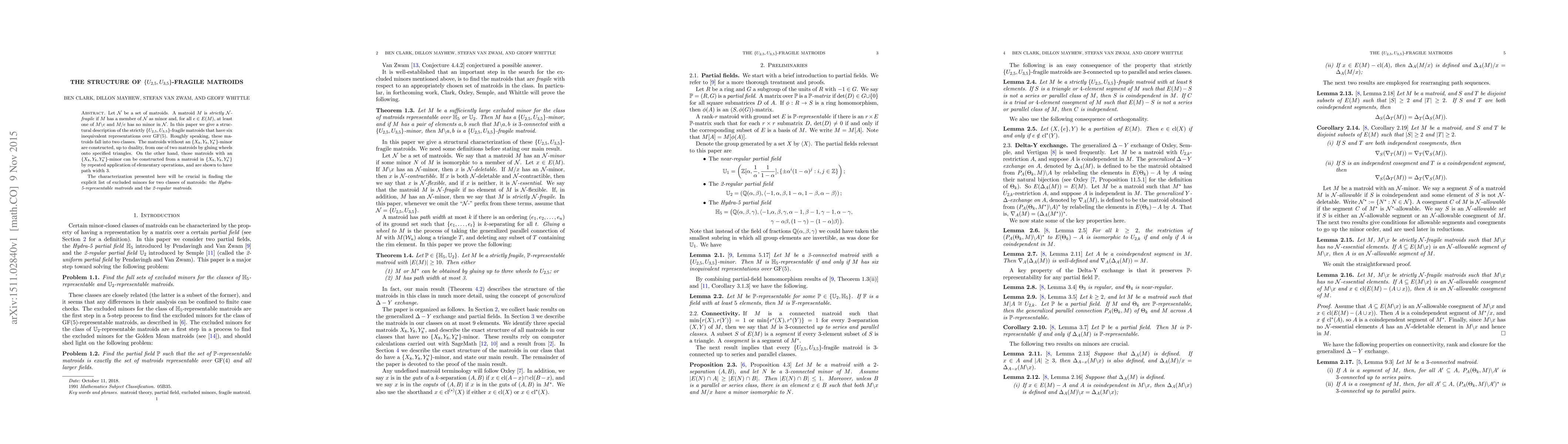 Let $\mathcal{N}$ be a set of matroids. A matroid $M$ is strictly $\mathcal{N}$-fragile if $M$ has a member of $\mathcal{N}$ as minor and, for all $e \in E(M)$, at least one of $M\backslash e$ and $M/e$ has no minor in $\mathcal{N}$. In this paper we give a structural description of the strictly $\{U_{2,5},U_{3,5}\}$-fragile matroids that have six inequivalent representations over $\mathrm{GF}(5)$. Roughly speaking, these matroids fall into two classes. The matroids without an $\{X_8, Y_8, Y_8^{*}\}$-minor are constructed, up to duality, from one of two matroids by gluing wheels onto specified triangles. On the other hand, those matroids with an $\{X_8, Y_8, Y_8^{*}\}$-minor can be constructed from a matroid in $\{X_8, Y_8, Y_8^{*}\}$ by repeated application of elementary operations, and are shown to have path width 3. The characterization presented here will be crucial in finding the explicit list of excluded minors for two classes of matroids: the Hydra-5-representable matroids and the 2-regular matroids.