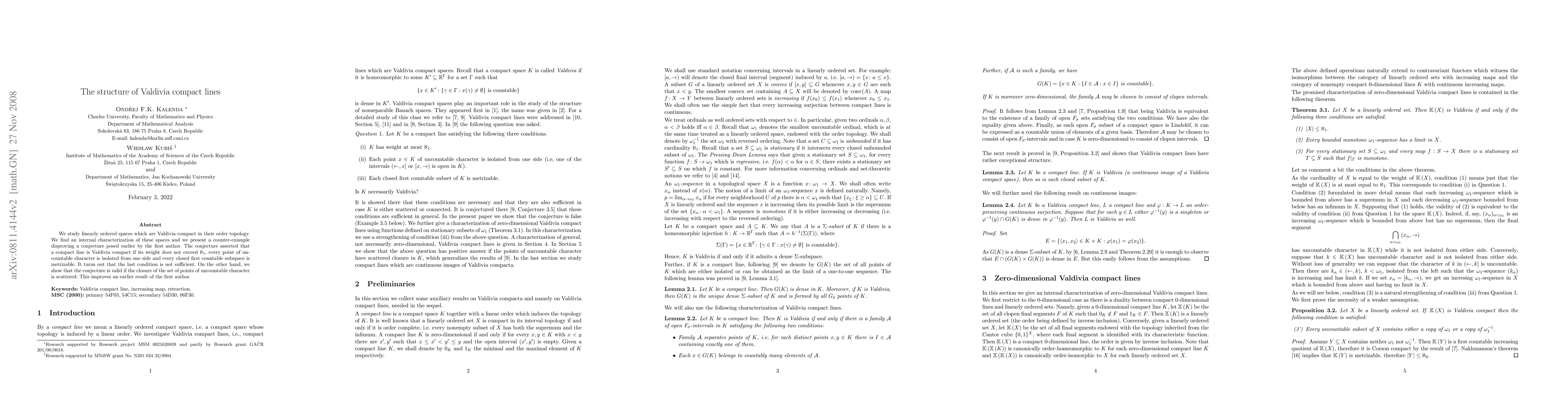 We study linearly ordered spaces which are Valdivia compact in their order topology. We find an internal characterization of these spaces and we present a counter-example disproving a conjecture posed earlier by the first author. The conjecture asserted that a compact line is Valdivia compact if its weight does not exceed aleph one, every point of uncountable character is isolated from one side and every closed first countable subspace is metrizable. It turns out that the last condition is not sufficient. On the other hand, we show that the conjecture is valid if the closure of the set of points of uncountable character is scattered. This improves an earlier result of the first author.