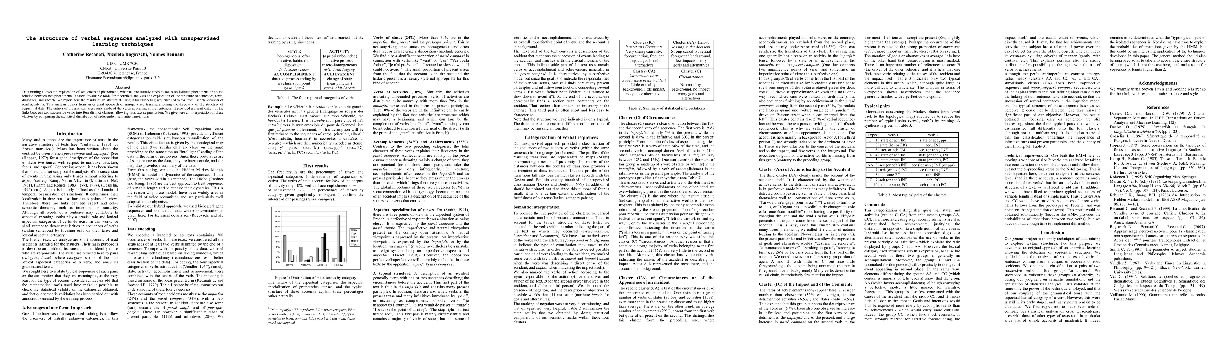Researchers used unsupervised learning techniques to analyze sequences of verbs from French road accident accounts, discovering four distinct clusters that allow for text segmentation and interpretation.