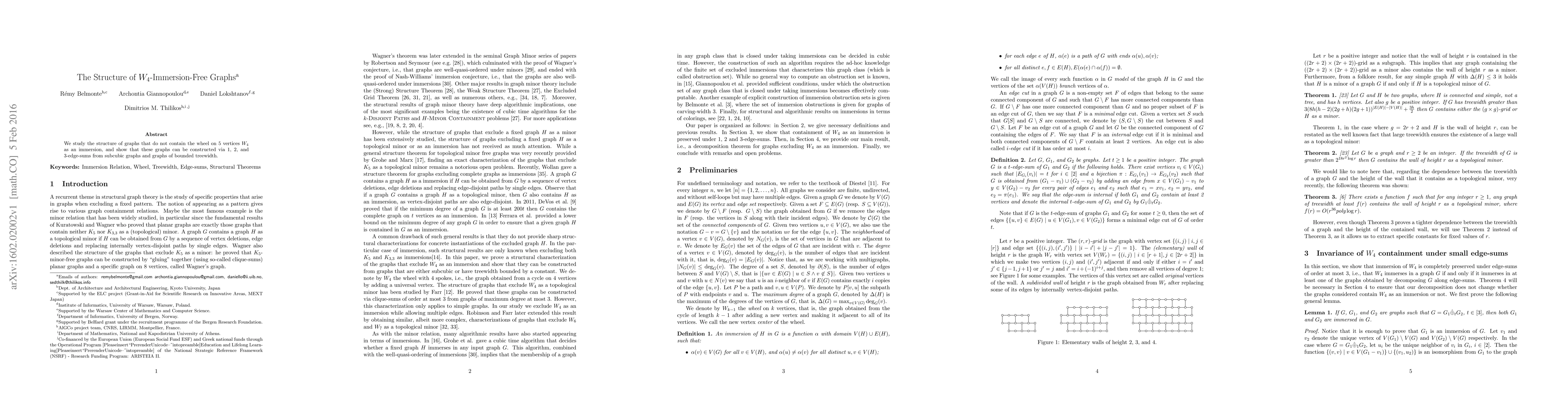 Summary: This paper explores the structural properties of graphs that exclude the wheel graph W4 as an immersion, demonstrating that these graphs can be formed through 1, 2, and 3-edge-sums from subcubic graphs and graphs with bounded treewidth.