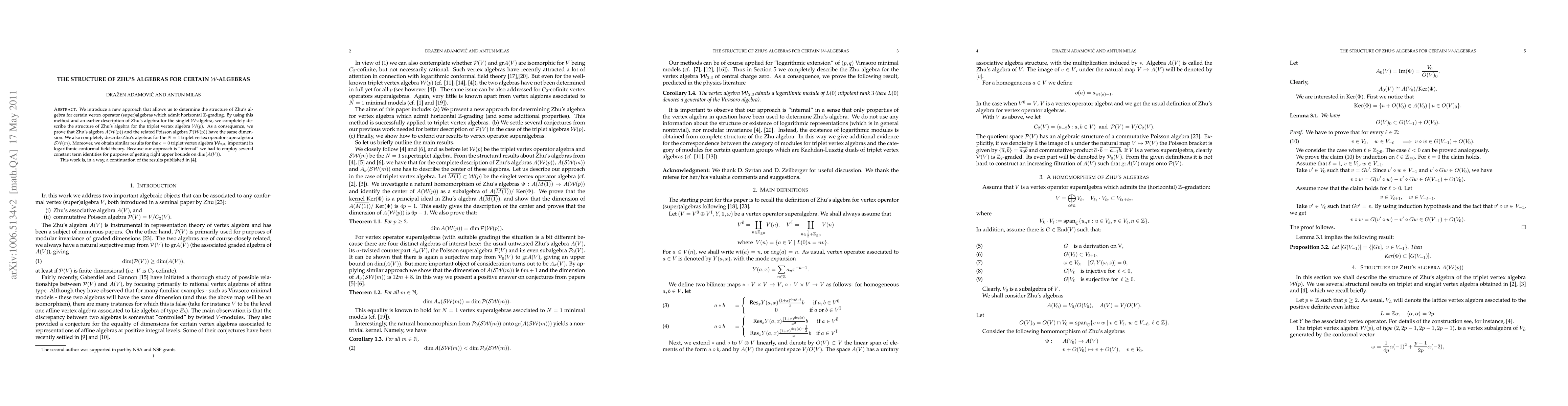 We introduce a new approach that allows us to determine the structure of Zhu's algebra for certain vertex operator (super)algebras which admit horizontal $\mathbb{Z} $-grading. By using this method and an earlier description of Zhu's algebra for the singlet W-algebra, we completely describe the structure of Zhu's algebra for the triplet vertex algebra W(p). As a consequence, we prove that Zhu's algebra A(W(p)) and the related Poisson algebra P(W(p)) have the same dimension. We also completely describe Zhu's algebras for the N=1 triplet vertex operator superalgebra SW(m). Moreover, we obtain similar results for the c=0 triplet vertex algebra W_{2,3} important in logarithmic conformal field theory. Because our approach is "internal" we had to employ several constant term identities for purposes of getting right upper bounds on dimension of Zhu's algebras.