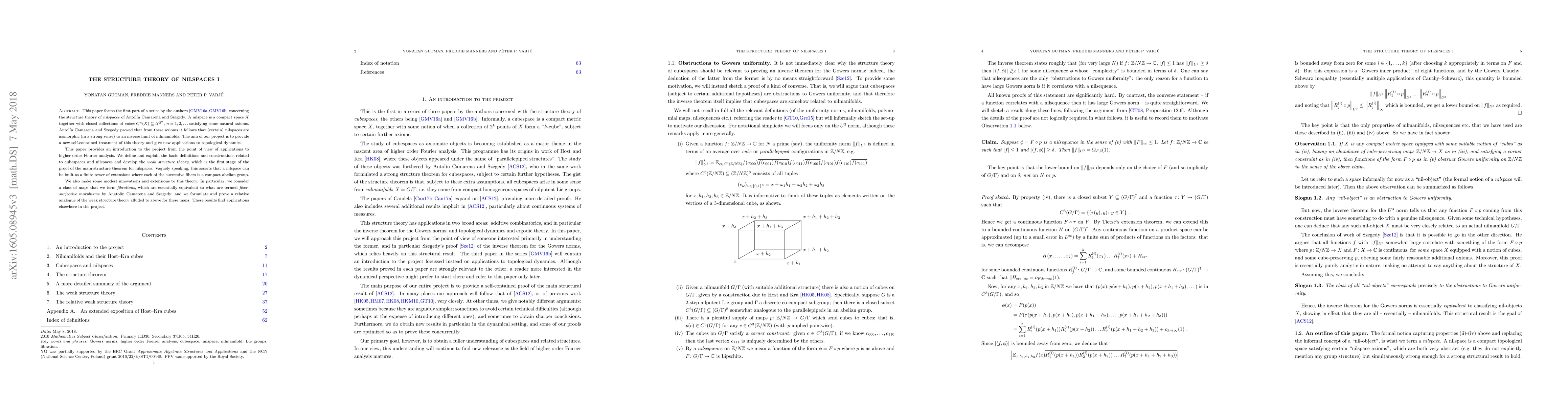 This paper forms the first part of a series by the authors [GMV2,GMV3] concerning the structure theory of nilspaces of Antol\'in Camarena and Szegedy. A nilspace is a compact space $X$ together with closed collections of cubes $C^n(X)\subseteq X^{2^n}$, $n=1,2,\ldots$ satisfying some natural axioms. Antol\'in Camarena and Szegedy proved that from these axioms it follows that (certain) nilspaces are isomorphic (in a strong sense) to an inverse limit of nilmanifolds. The aim of our project is to provide a new self-contained treatment of this theory and give new applications to topological dynamics. This paper provides an introduction to the project from the point of view of applications to higher order Fourier analysis. We define and explain the basic definitions and constructions related to cubespaces and nilspaces and develop the weak structure theory, which is the first stage of the proof of the main structure theorem for nilspaces. Vaguely speaking, this asserts that a nilspace can be built as a finite tower of extensions where each of the successive fibers is a compact abelian group. We also make some modest innovations and extensions to this theory. In particular, we consider a class of maps that we term fibrations, which are essentially equivalent to what are termed fiber-surjective morphisms by Anatol\'in Camarena and Szegedy, and we formulate and prove a relative analogue of the weak structure theory alluded to above for these maps. These results find applications elsewhere in the project.