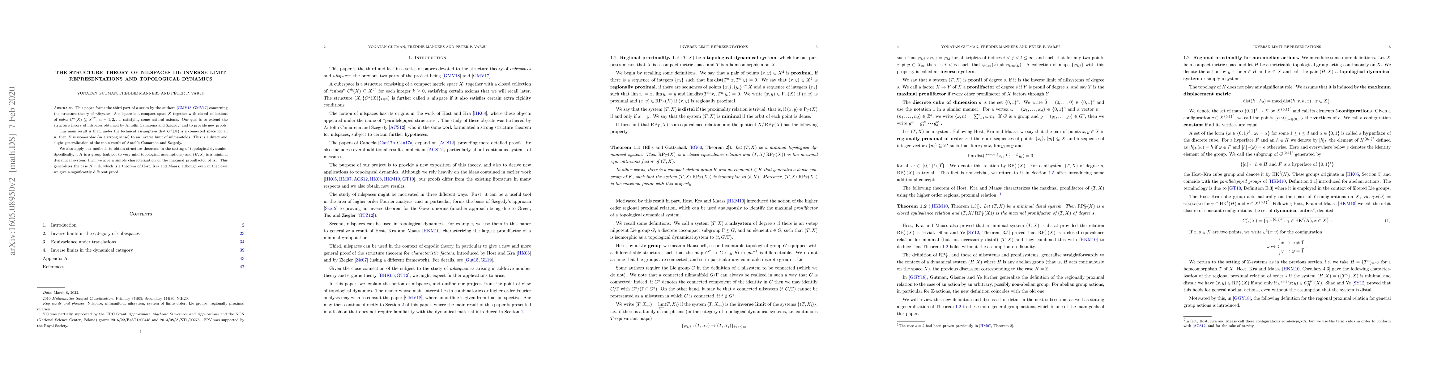 This paper forms the third part of a series by the authors [GMV1,GMV2] concerning the structure theory of nilspaces. A nilspace is a compact space $X$ together with closed collections of cubes $C^n(X)\subseteq X^{2^n}$, $n=1,2,\ldots$, satisfying some natural axioms. Our goal is to extend the structure theory of nilspaces obtained by Antol\'in Camarena and Szegedy, and to provide new proofs. Our main result is that, under the technical assumption that $C^n(X)$ is a connected space for all $n$, then $X$ is isomorphic (in a strong sense) to an inverse limit of nilmanifolds. This is a direct and slight generalization of the main result of Antol\'in Camarena and Szegedy. We also apply our methods to obtain structure theorems in the setting of topological dynamics. Specifically, if $H$ is a group (subject to very mild topological assumptions) and $(H,X)$ is a minimal dynamical system, then we give a simple characterization of the maximal pronilfactor of $X$. This generalizes the case $H = \mathbb{Z}$, which is a theorem of Host, Kra and Maass, although even in that case we give a significantly different proof.