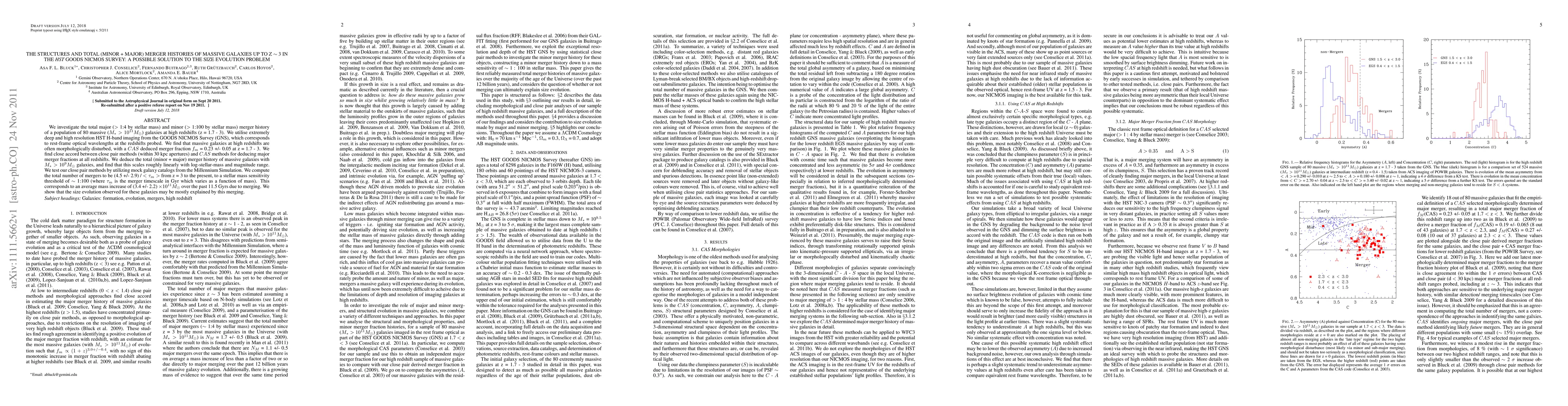 This study examines the merger histories of 80 massive galaxies up to redshift z = 3 using HST imaging, finding a high merger fraction and suggesting that mergers significantly contribute to the size evolution of these galaxies. The total merger history scales linearly with stellar mass, resulting in an average mass increase of 3.4 x 10^11 M_sol over 11.5 Gyrs due to merging.