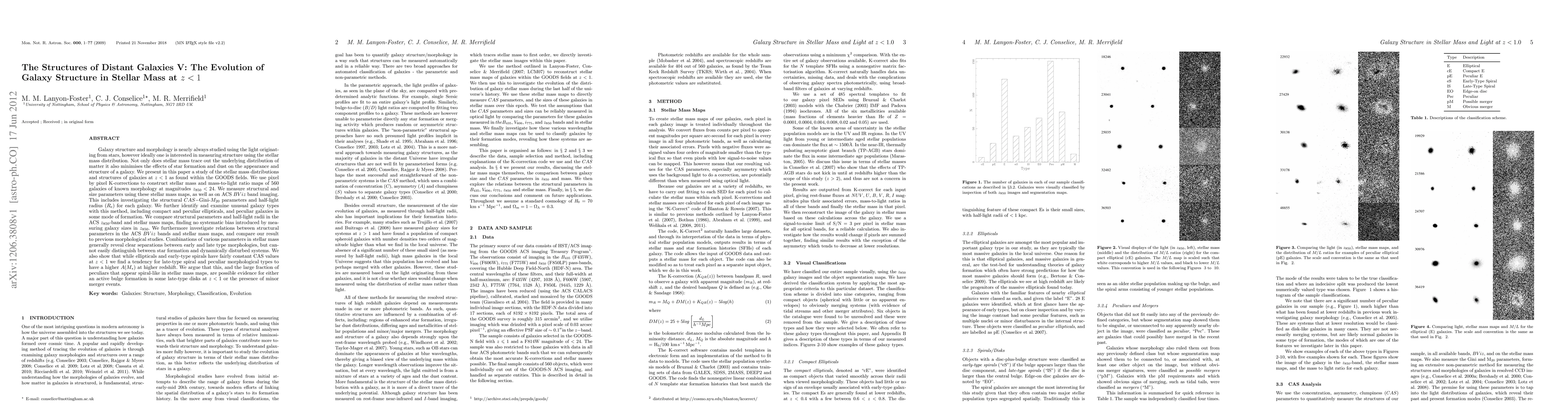 Galaxy structure and morphology is nearly always studied using the light originating from stars, however ideally one is interested in measuring structure using the stellar mass distribution. Not only does stellar mass trace out the underlying distribution of matter, it also minimises the effects of star formation and dust on the appearance and structure of a galaxy. We present in this paper a study of the stellar mass distributions and structures of galaxies at z<1 as found within the GOODS fields. We use pixel by pixel K-corrections to construct stellar mass and mass-to-light ratio maps of 560 galaxies of known morphology at magnitudes z_{850}<24. We measure structural and size parameters using these stellar mass maps, as well as on ACS BViz band imaging. This includes investigating the structural CAS-Gini-M_{20} parameters and half-light radius for each galaxy. We compare structural parameters and half-light radii in the ACS z_{850}-band and stellar mass maps, finding no systematic bias introduced by measuring galaxy sizes in z_{850}. We furthermore investigate relations between structural parameters in the ACS BViz bands and stellar mass maps, and compare our result to previous morphological studies. Combinations of various parameters in stellar mass generally reveal clear separations between early and late type morphologies, but cannot easily distinguish between star formation and dynamically disturbed systems. We also show that while ellipticals and early-type spirals have fairly constant CAS values at z<1 we find a tendency for late-type spiral and peculiar morphological types to have a higher A(M_{*}) at higher redshift. We argue that this, and the large fraction of peculiars that appear spiral-like in stellar mass maps, are possible evidence for either an active bulge formation in some late-type disks at z<1 or the presence of minor merger events.
