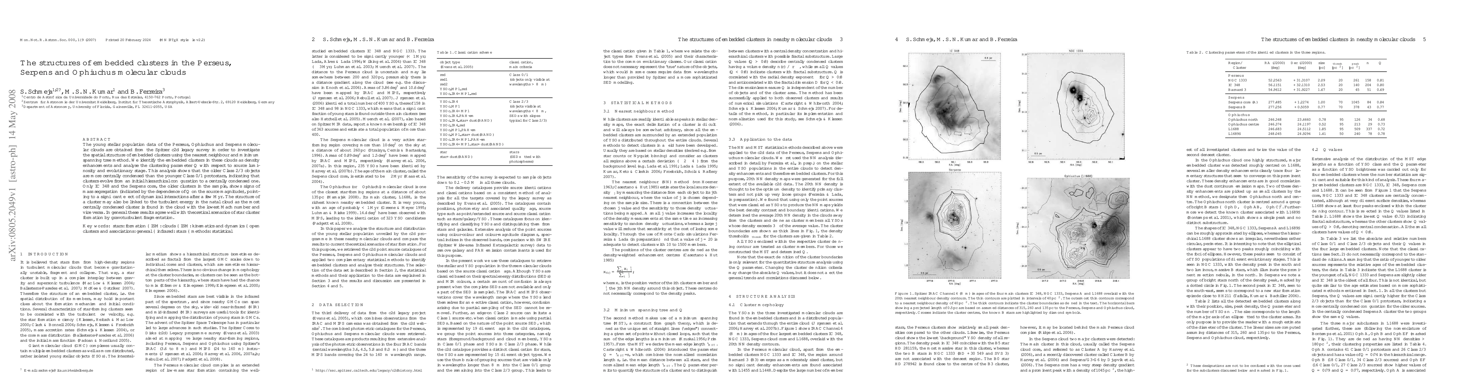 This study uses Spitzer data to analyze the spatial structure of embedded clusters in Perseus, Ophiuchus, and Serpens molecular clouds, finding that older clusters are more centrally condensed, suggesting evolution from hierarchical to condensed configurations, with mass segregation and turbulent energy influencing cluster structure.
