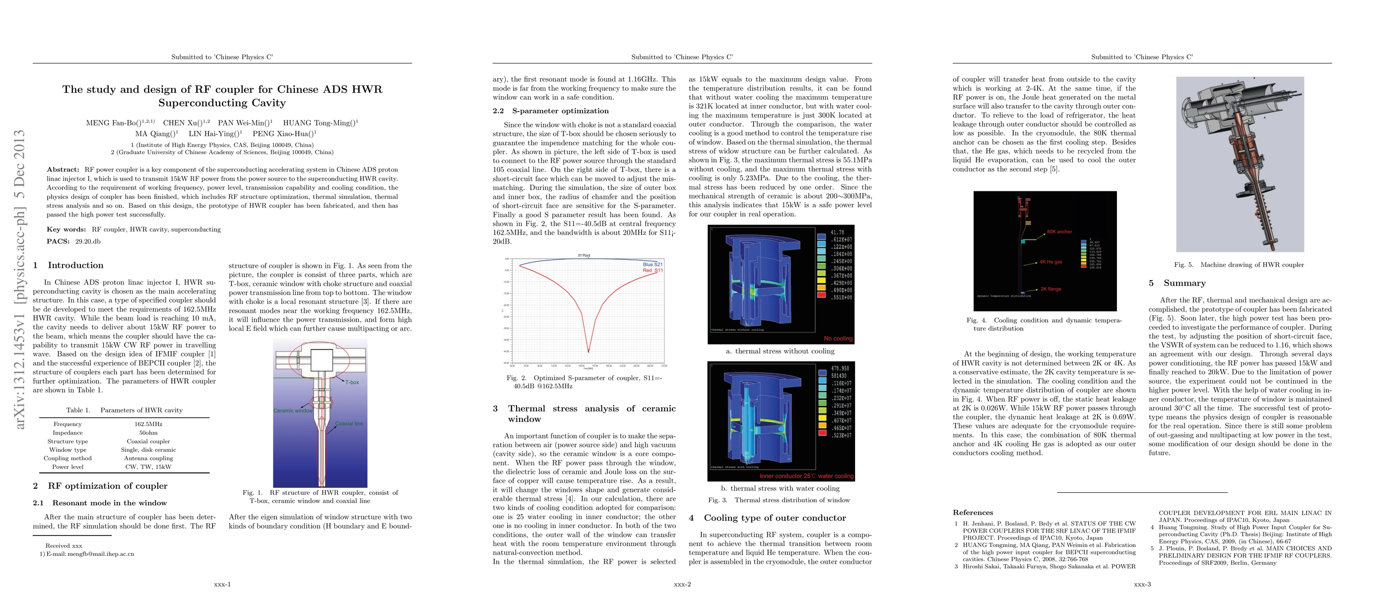 This paper details the design and optimization of an RF coupler for the Chinese ADS proton linac injector I, focusing on transmitting 15kW RF power to a superconducting HWR cavity. The study includes RF structure optimization, thermal simulation, and stress analysis, culminating in the successful fabrication and high-power testing of a prototype.