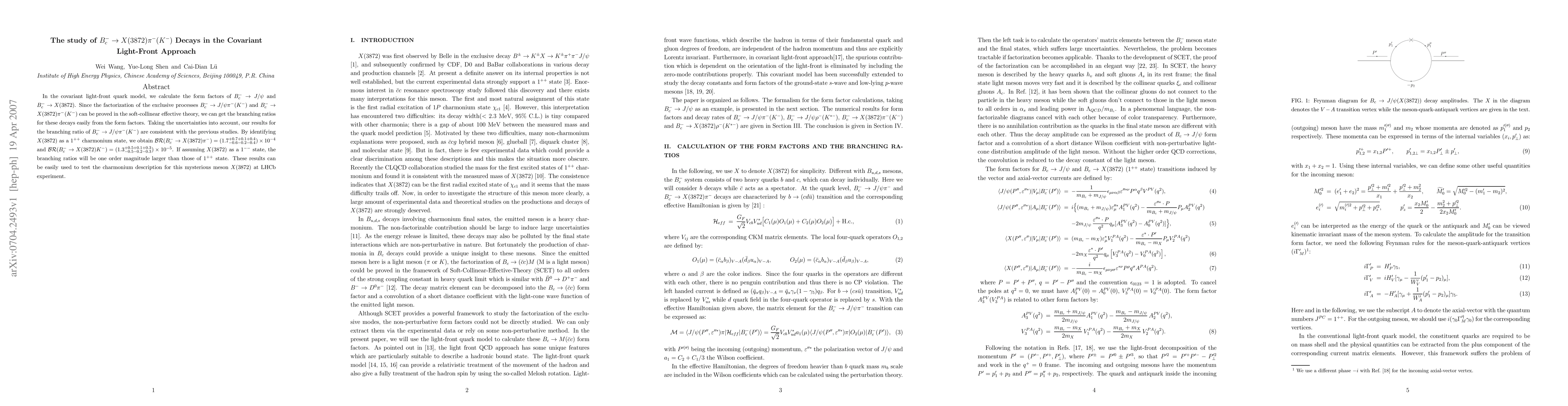 This study calculates the form factors for $B_c^-$ decays to $J/\psi$ and $X(3872)$ using the covariant light-front quark model, obtaining branching ratios for $B_c^-\to J/\psi\pi^-(K^-)$ and $B_c^-\to X(3872)\pi^-(K^-)$. The results suggest ${\cal BR}(B_c^-\to X(3872)\pi^-)$ and ${\cal BR}(B_c^-\to X(3872)K^-)$ depend on whether X(3872) is a $1^{++}$ or $1^{--}$ state.