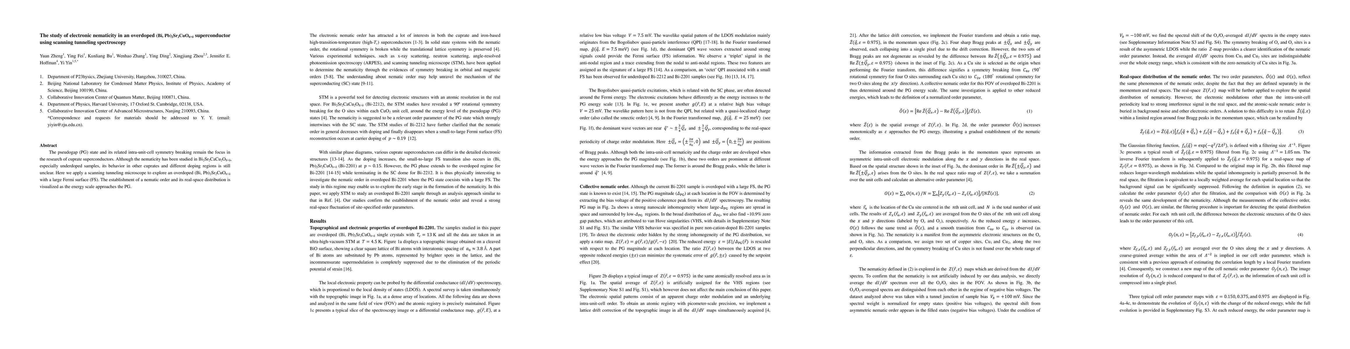 The pseudogap (PG) state and its related intra-unit-cell symmetry breaking remain the focus in the research of cuprate superconductors. Although the nematicity has been studied in Bi$_2$Sr$_2$CaCu$_2$O$_{8+\delta}$, especially underdoped samples, its behavior in other cuprates and different doping regions is still unclear. Here we apply a scanning tunneling microscope to explore an overdoped (Bi, Pb)$_2$Sr$_2$CuO$_{6+\delta}$ with a large Fermi surface (FS). The establishment of a nematic order and its real-space distribution is visualized as the energy scale approaches the PG.
