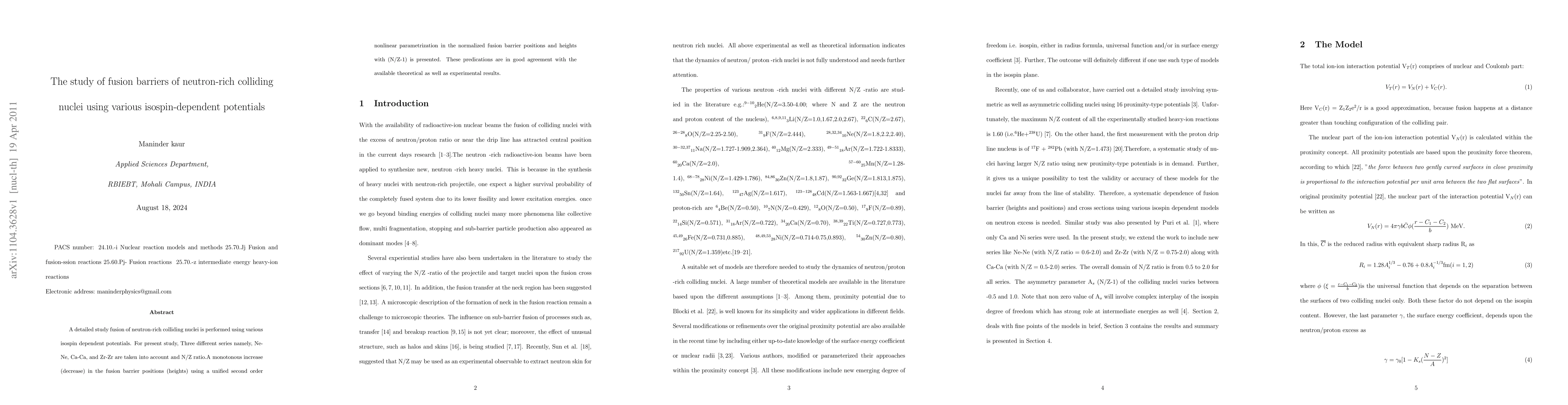 A detailed study fusion of neutron-rich colliding nuclei is performed using various isospin dependent potentials. For present study, Three different series namely, Ne-Ne, Ca-Ca, and Zr-Zr are taken into account and N/Z ratio.A monotonous increase (decrease) in the fusion barrier positions (heights) using a unified second order nonlinear parametrization in the normalized fusion barrier positions and heights with (N/Z-1) is presented. These predications are in good agreement with the available theoretical as well as experimental results.
