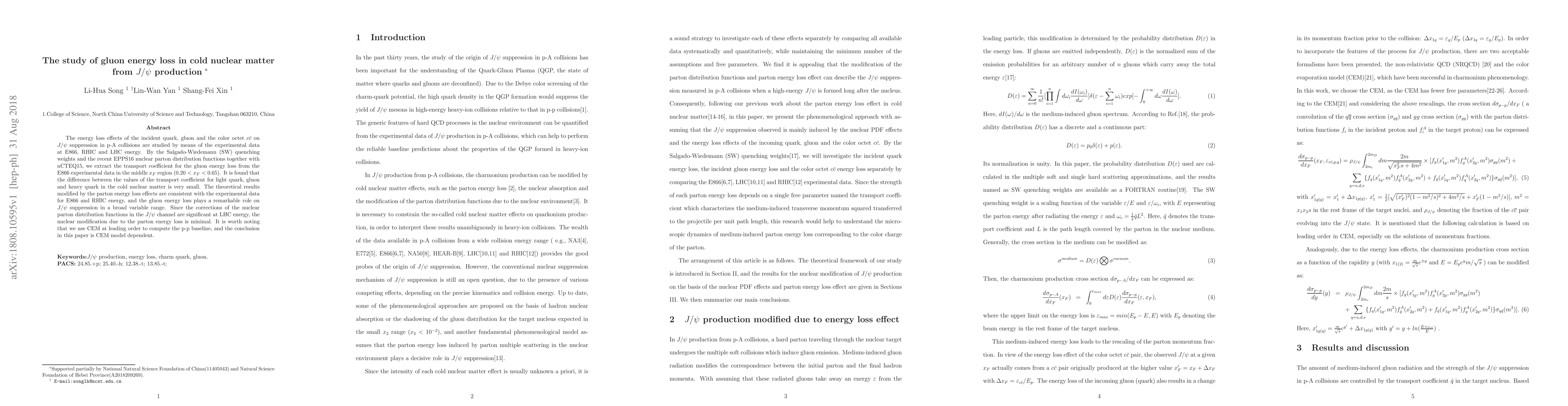 This study investigates gluon energy loss in cold nuclear matter through $J/\psi$ production in p-A collisions, finding minimal differences in transport coefficients for light quarks, gluons, and heavy quarks. The theoretical results align well with experimental data, highlighting the significant role of gluon energy loss in $J/\psi$ suppression.
