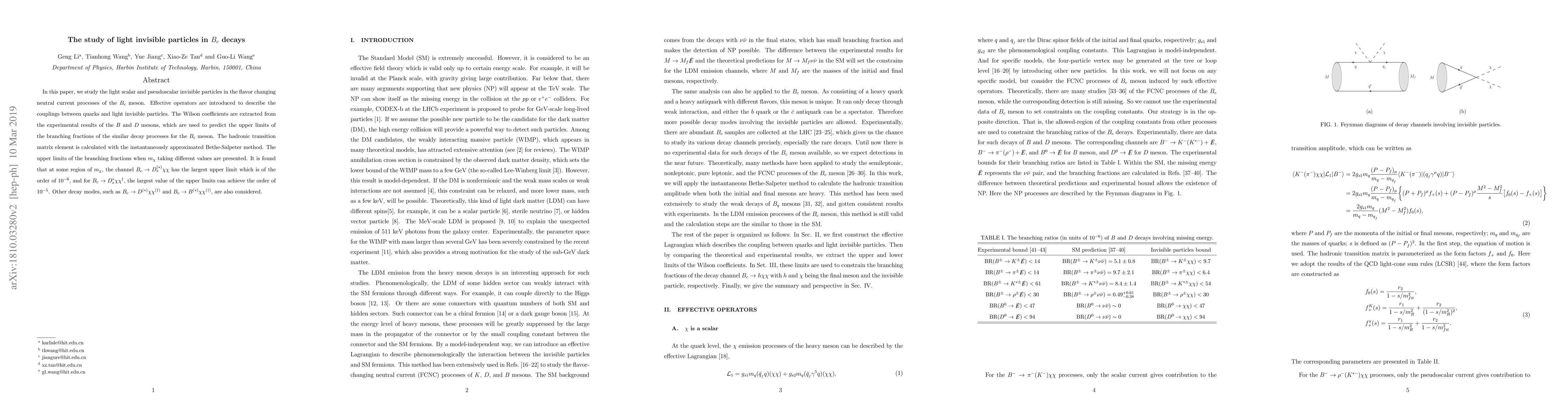 Researchers studied light invisible particles in $B_c$ meson decays using experimental data from $B$ and $D$ mesons to predict upper limits for branching fractions.