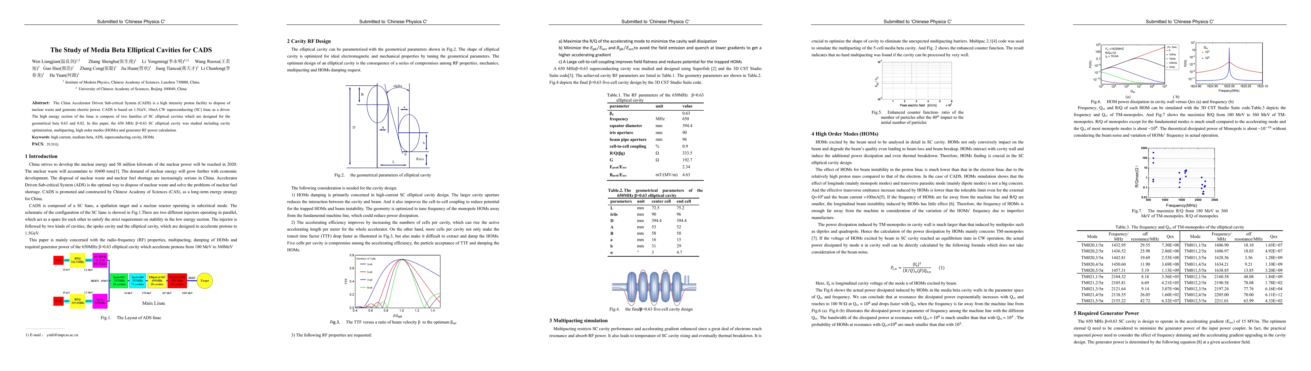 This paper investigates the 650 MHz beta=0.63 superconducting elliptical cavity used in the China Accelerator Driven Sub-critical System (CADS) for nuclear waste disposal and power generation, focusing on cavity optimization, multipacting, high-order modes, and RF power calculations. Keywords highlight the relevance of high current, medium beta, ADS, and superconducting cavities.