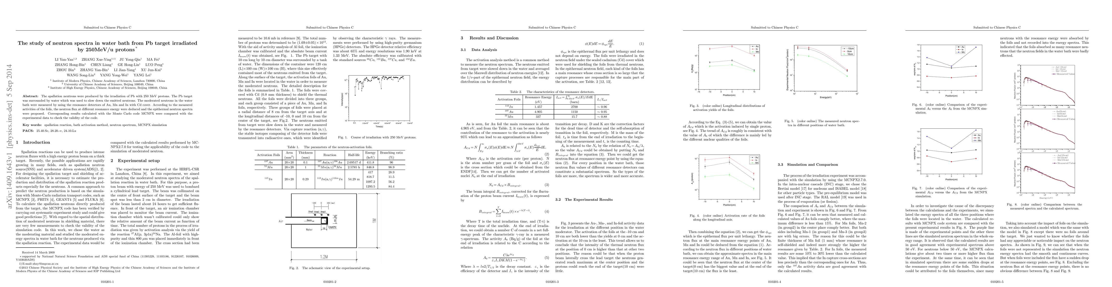 The spallation neutrons were produced by the irradiation of Pb with 250 MeV protons. The Pb target was surrounded by water which was used to slow down the emitted neutrons. The moderated neutrons in the water bath were measured by using the resonance detectors of Au, Mn and In with Cd cover. According to the measured activities of the foils, the neutron flux at different resonance energy were deduced and the epithermal neutron spectra were proposed. Corresponding results calculated with the Monte Carlo code MCNPX were compared with the experimental data to check the validity of the code.