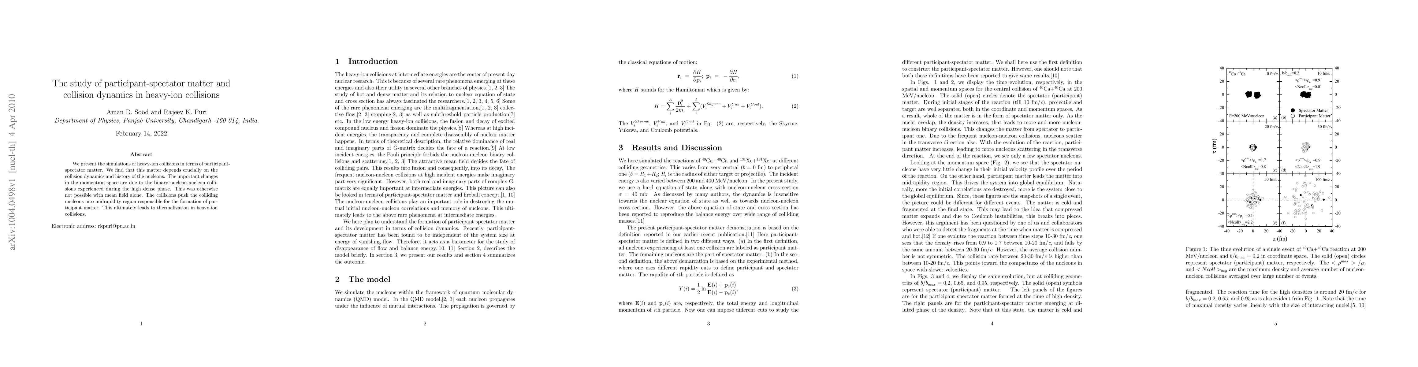 We present the simulations of heavy-ion collisions in terms of participant-spectator matter. We find that this matter depends crucially on the collision dynamics and history of the nucleons. The important changes in the momentum space are due to the binary nucleon-nucleon collisions experienced during the high dense phase. This was otherwise not possible with mean field alone. The collisions push the colliding nucleons into midrapidity region responsible for the formation of participant matter. This ultimately leads to thermalization in heavy-ion collisions.