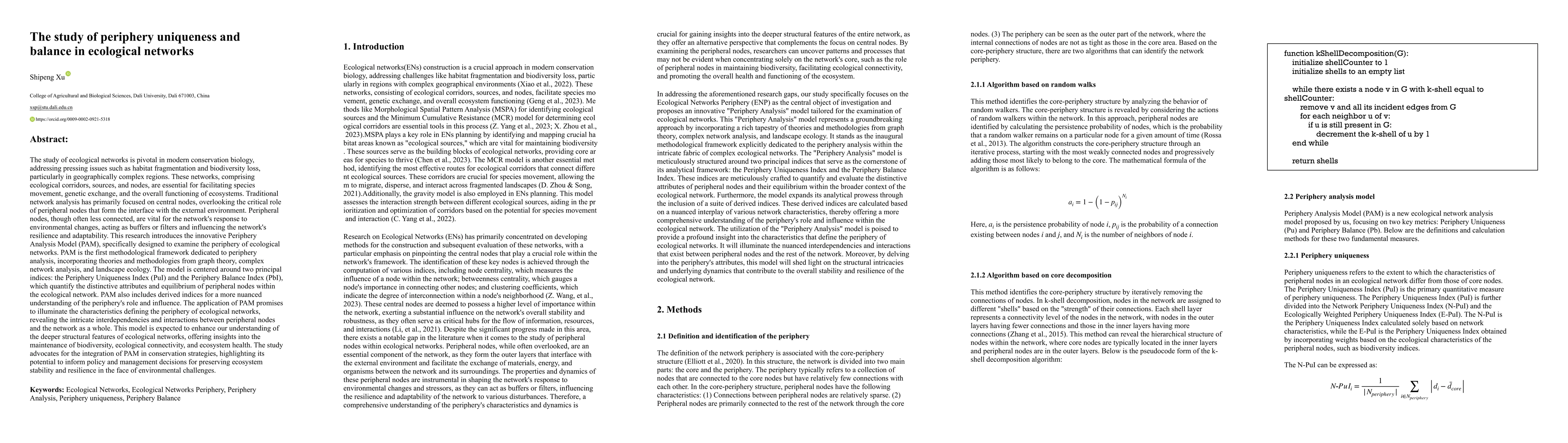 This paper introduces the Periphery Analysis Model (PAM) to evaluate ecological networks' periphery, using the Periphery Uniqueness Index (PuI) and the Periphery Balance Index (PbI) to understand peripheral nodes' roles in network resilience and environmental change response, with implications for conservation strategies.