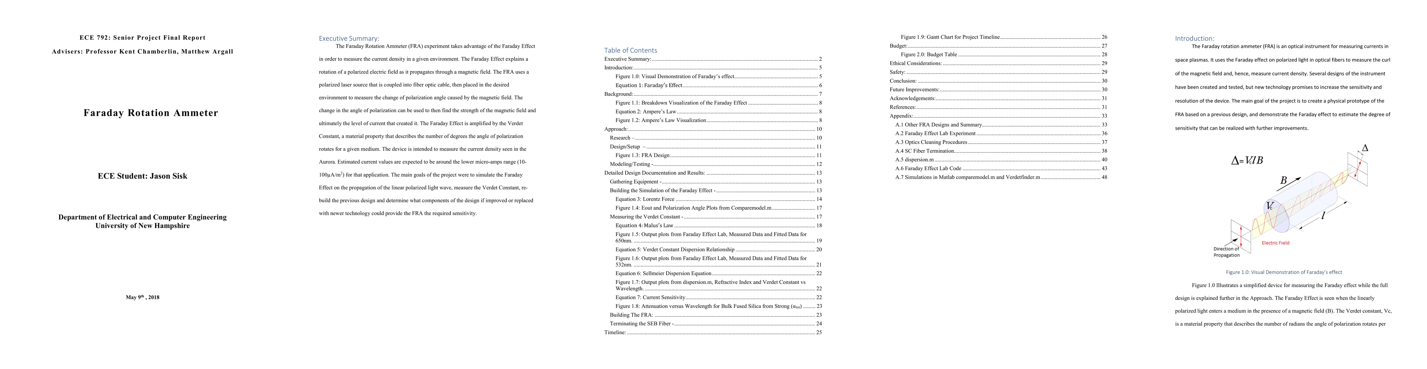 The Faraday Rotation Ammeter (FRA) experiment takes advantage of the Faraday Effect in order to measure the current density in a given environment. The Faraday Effect explains a rotation of a polarized electric field as it propagates through a magnetic field. The FRA uses a polarized laser source that is coupled into fiber optic cable, then placed in the desired environment to measure the change of polarization angle caused by the magnetic field. The change in the angle of polarization can be used to then find the strength of the magnetic field and ultimately the level of current that created it. The Faraday Effect is amplified by the Verdet Constant, a material property that describes the number of degrees the angle of polarization rotates for a given medium. The device is intended to measure the current density seen in the Aurora. Estimated current values are expected to be around the lower micro-amps range (10-100mA/m^2) for that application. The main goals of the project were to simulate the Faraday Effect on the propagation of the linear polarized light wave, measure the Verdet Constant, re-build the previous design and determine what components of the design if improved or replaced with newer technology could provide the FRA the required sensitivity.