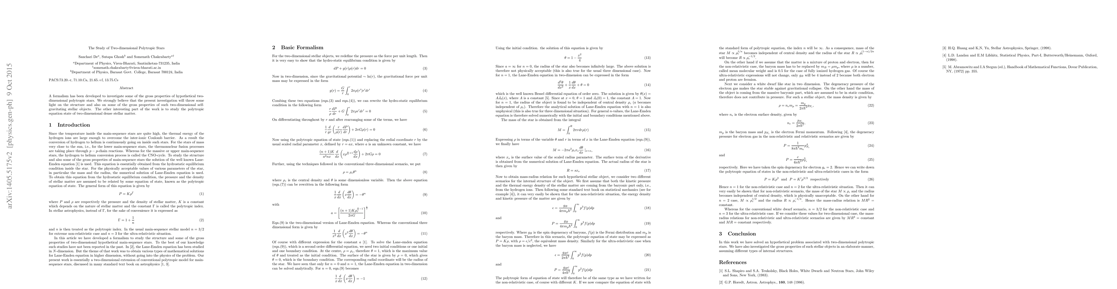 In this article we have studied the structure of hypothetical two-dimensional polytropic stars. Considering some academic interest, we have developed a formalism to investigate some of the gross properties of such stellar objects. However, we strongly believe that the formalism developed here may be prescribed as class problem for post-graduate level students in physics or a post-graduate dissertation project work in physics.