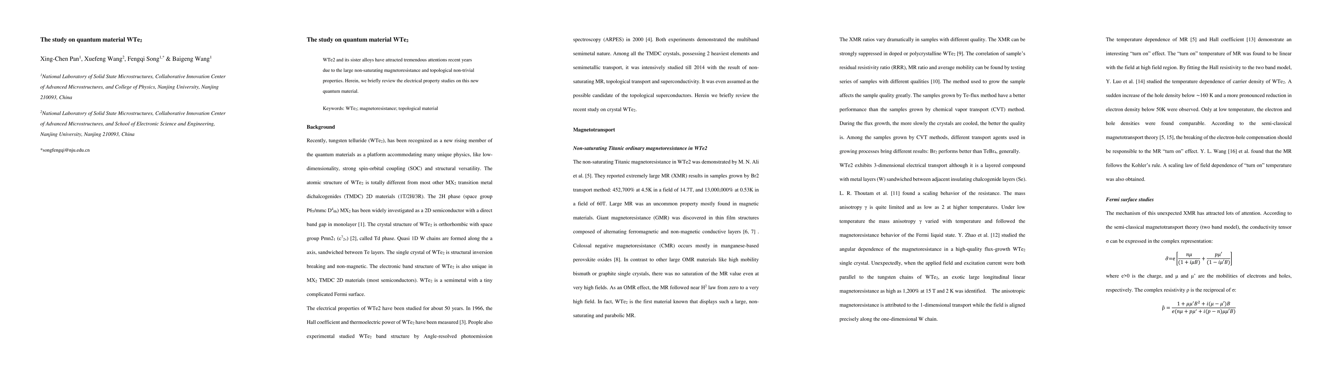This review summarizes recent studies on WTe2, highlighting its large non-saturating magnetoresistance and topological non-trivial properties, crucial for quantum material research.