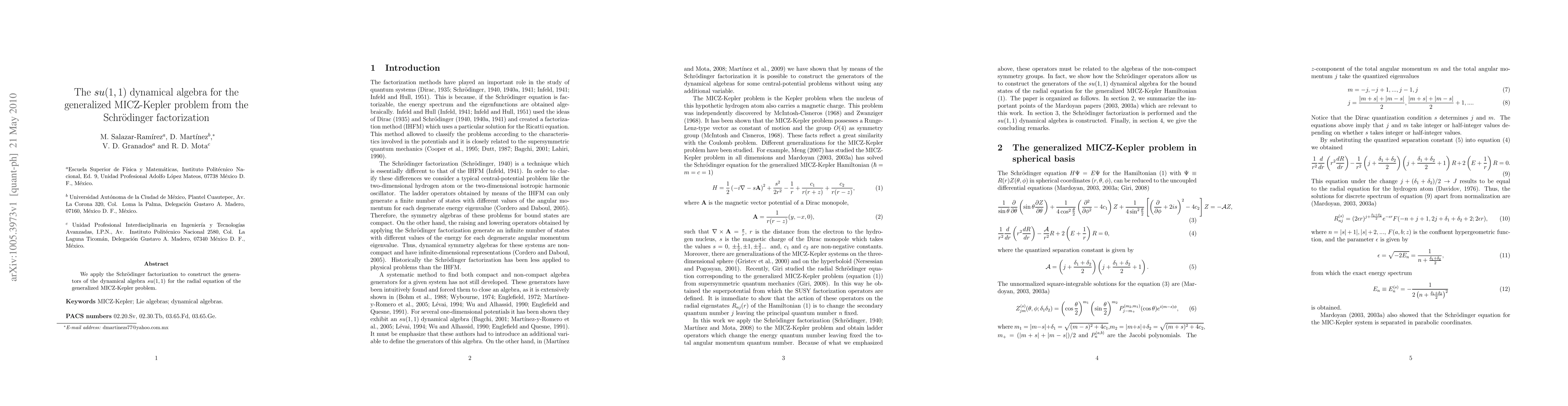 Summary: This paper utilizes Schrödinger factorization to derive the $su(1,1)$ dynamical algebra generators for the radial equation of the generalized MICZ-Kepler problem, providing a mathematical framework for its analysis.