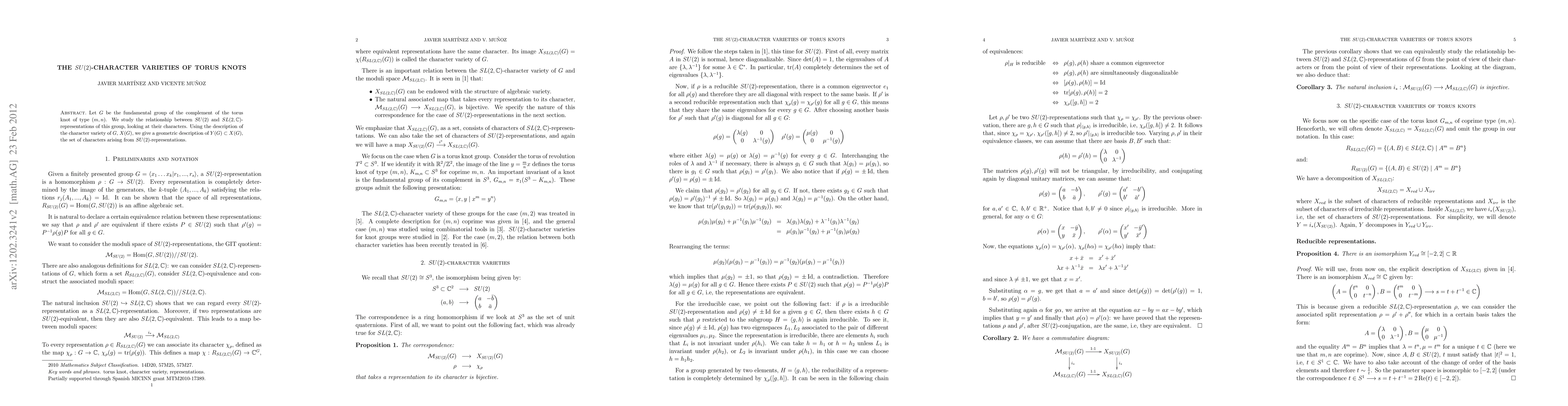 This paper investigates the relationship between SU(2) and SL(2,C) representations of the fundamental group of a torus knot's complement, focusing on the characters of these representations. It provides a geometric description of the SU(2)-character variety Y(G) within the SL(2,C)-character variety X(G).