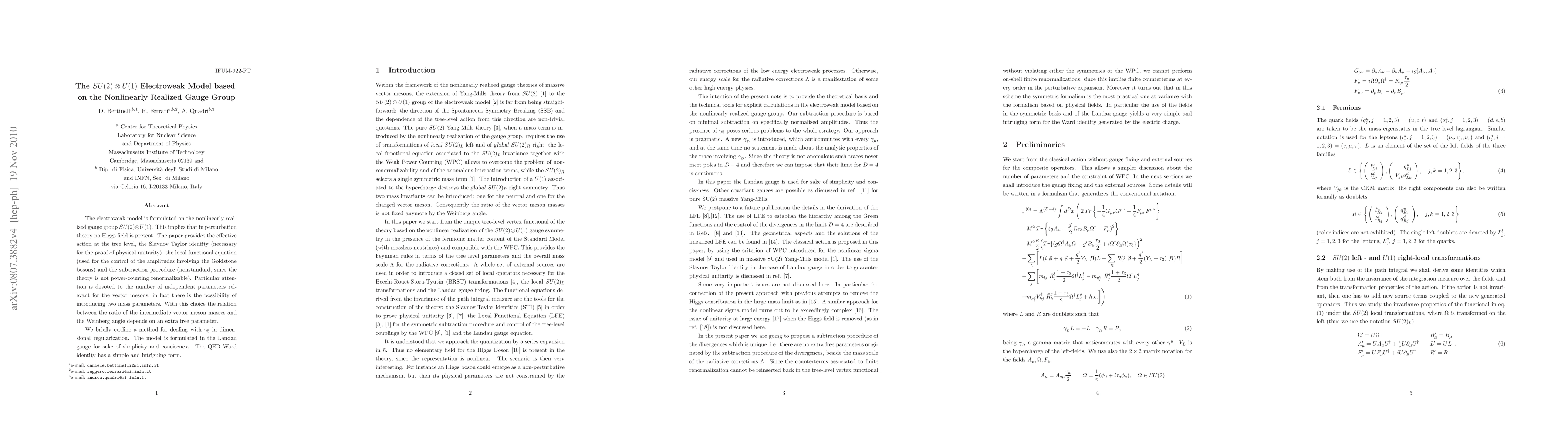 This research paper formulates the electroweak model based on the nonlinearly realized gauge group SU(2) × U(1), avoiding the Higgs field in perturbation theory. It presents the effective action, Slavnov-Taylor identity, local functional equation, and a nonstandard subtraction procedure due to the theory's non-renormalizability. The model introduces two mass parameters, influencing the relation between vector meson masses and the Weinberg angle, and is formulated in the Landau gauge for simplicity.