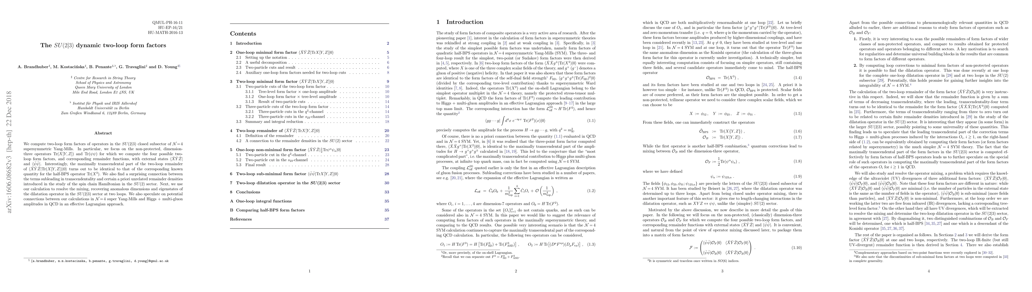 We compute two-loop form factors of operators in the $SU(2|3)$ closed subsector of $N=4$ supersymmetric Yang-Mills. In particular, we focus on the non-protected, dimension-three operators $\mathrm{Tr} (X[Y,Z])$ and $\mathrm{Tr} ( \psi \psi)$ for which we compute the four possible two-loop form factors, and corresponding remainder functions, with external states $\langle \bar{X} \bar{Y} \bar{Z}|$ and $\langle \bar{\psi} \bar{\psi}|$. Interestingly, the maximally transcendental part of the two-loop remainder of $\langle\bar{X} \bar{Y} \bar{Z}| \mathrm{Tr} (X[Y,Z]) |0\rangle$ turns out to be identical to that of the corresponding known quantity for the half-BPS operator $\mathrm{Tr} (X^3)$. We also find a surprising connection between the terms subleading in transcendentality and certain a priori unrelated remainder densities introduced in the study of the spin chain Hamiltonian in the SU(2) sector. Next, we use our calculation to resolve the mixing, recovering anomalous dimensions and eigenstates of the dilatation operator in the SU(2|3) sector at two loops. We also speculate on potential connections between our calculations in $N=4$ super Yang-Mills and Higgs + multi-gluon amplitudes in QCD in an effective Lagrangian approach.