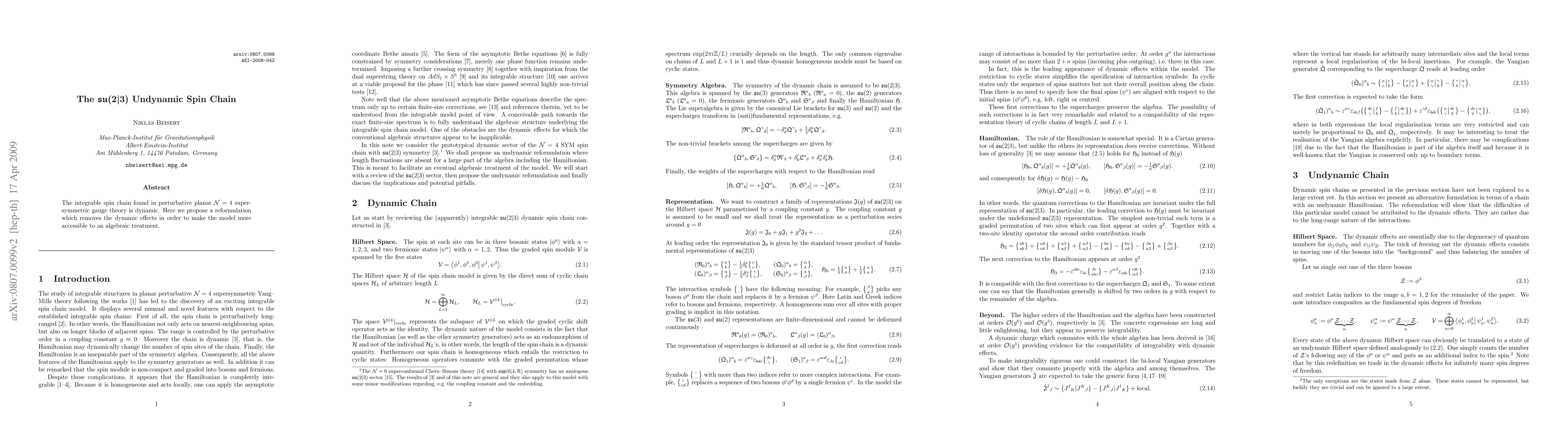 The integrable spin chain found in perturbative planar N=4 supersymmetric gauge theory is dynamic. Here we propose a reformulation which removes the dynamic effects in order to make the model more accessible to an algebraic treatment.